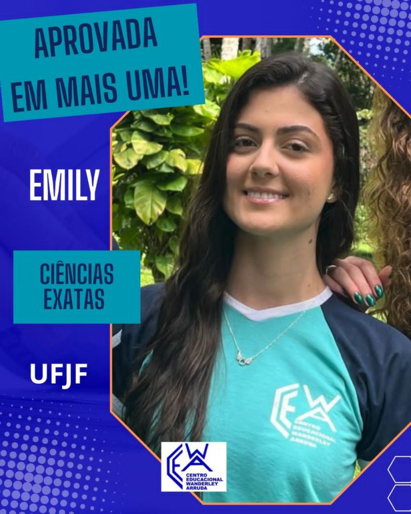 A estudante Emily conquistou duas importantes aprovações no ensino superior, confirmando o excelente desempenho acadêmico e o trabalho de qualidade realizado pelo Centro Educacional Wanderley Arruda (CEWA).Ela garantiu vaga no curso de Ciências Exatas pela Universidade Federal de Juiz de Fora (UFJF) e também foi aprovada em Engenharia Civil pela Universidade Federal de São João del-Rei (UFSJ), alcançando ainda o 4º lugar na classificação.