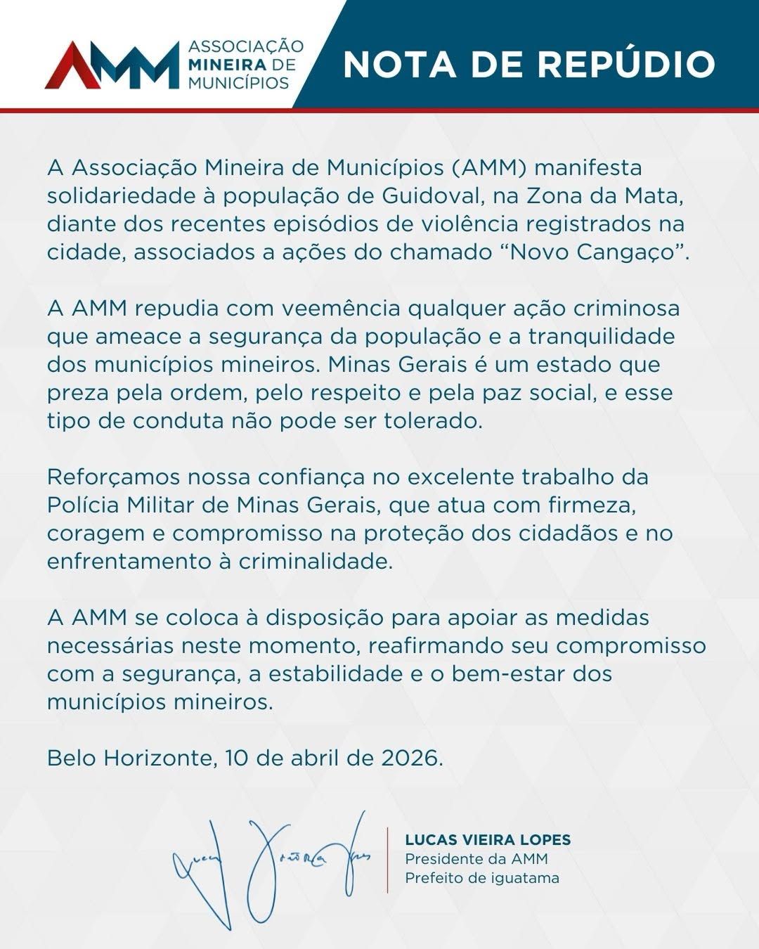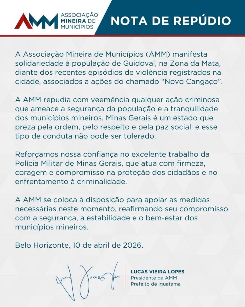 A Associação Mineira de Municípios (AMM) divulgou nesta sexta-feira (10/04) uma nota de repúdio aos recentes episódios de violência registrados em Guidoval, na Zona da Mata mineira, atribuídos a ações do chamado “Novo Cangaço”. No comunicado, a entidade manifestou solidariedade à população da cidade e condenou de forma veemente qualquer ação criminosa que coloque em risco a segurança da população e a tranquilidade dos municípios mineiros. A AMM destacou ainda confiança no trabalho da Polícia Militar de Minas Gerais, ressaltando a atuação da corporação no enfrentamento à criminalidade e na proteção dos cidadãos. A associação também colocou sua estrutura à disposição para apoiar as medidas necessárias neste momento, reafirmando compromisso com a segurança, a estabilidade e o bem-estar da população mineira.