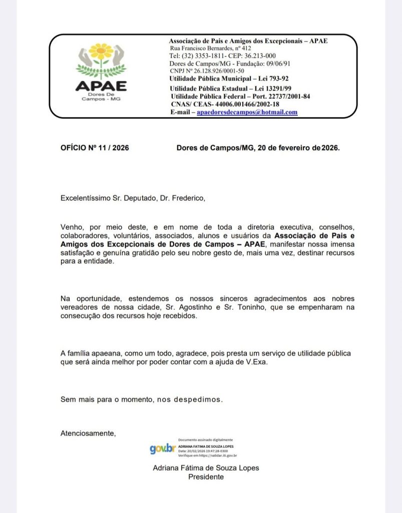 A Associação de Pais e Amigos dos Excepcionais (APAE) de Dores de Campos encaminhou ofício de agradecimento ao deputado federal Dr. Frederico pela destinação de recursos à entidade. O documento é datado desta quinta-feira, 20 de fevereiro de 2026.