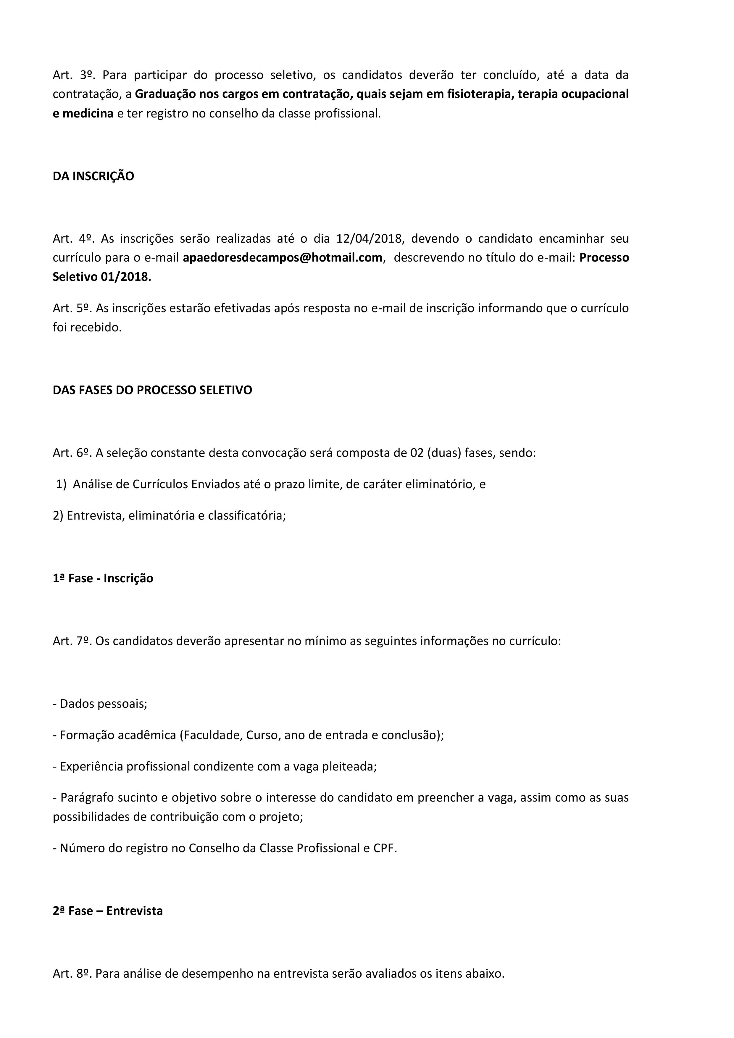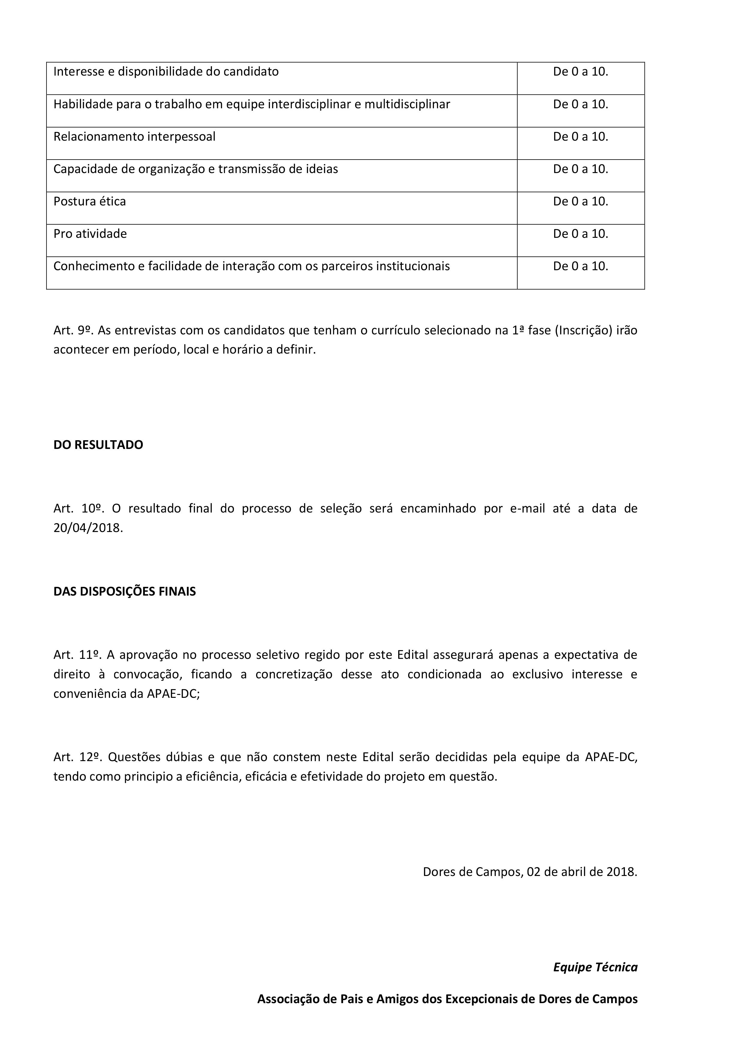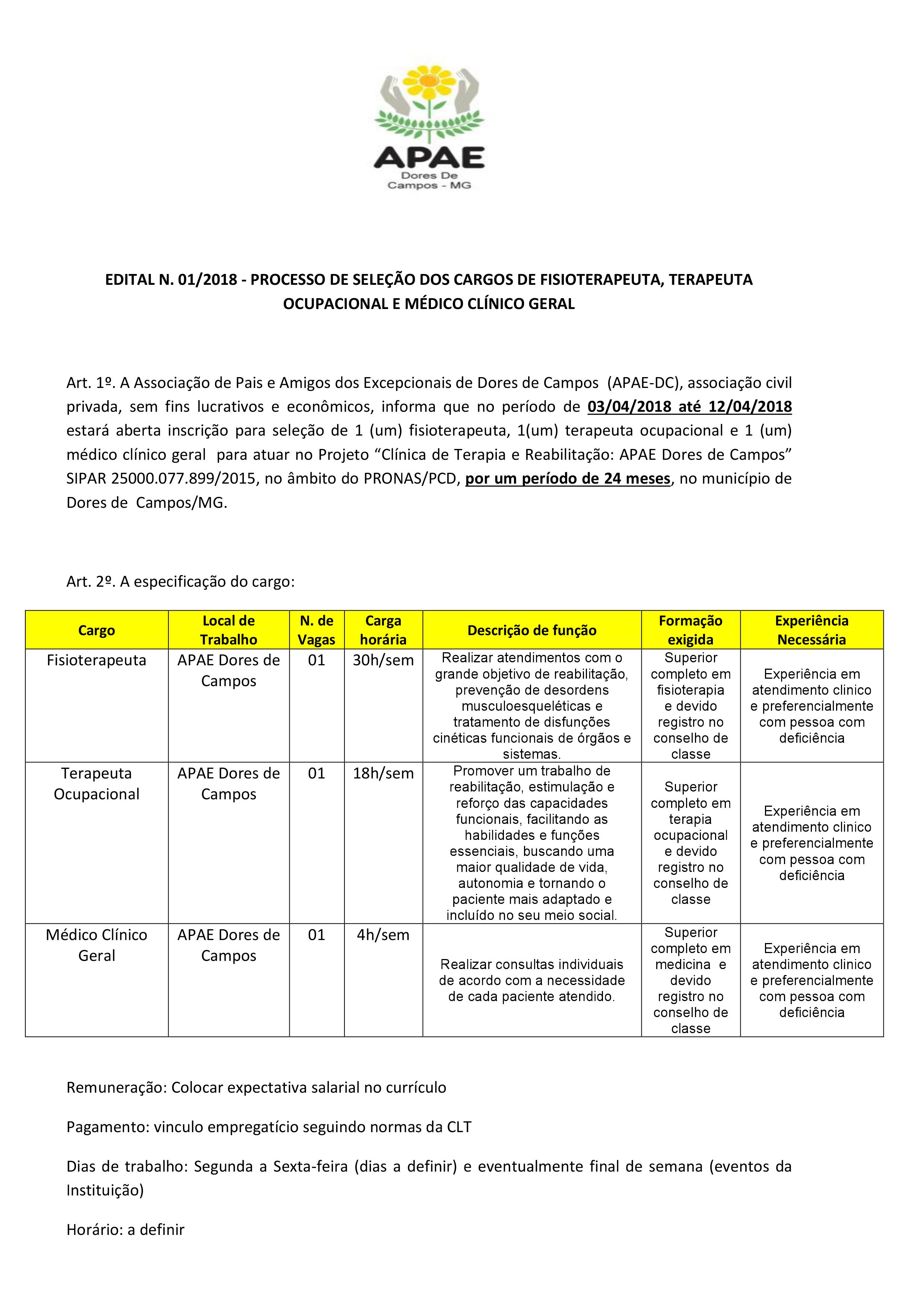A APAE de Dores de Campos torna público o Edital do Processo Seletivo 01/2018 para os cargos de Terapia Ocupacional, Fisioterapeuta e Médico Clínico Geral, por um período de 24 meses (dois anos), para trabalhar na Clínica de Terapia e Reabilitação, através do Programa Nacional de Apoio à Atenção da Saúde da Pessoa com Deficiência (PRONAS/PCD).