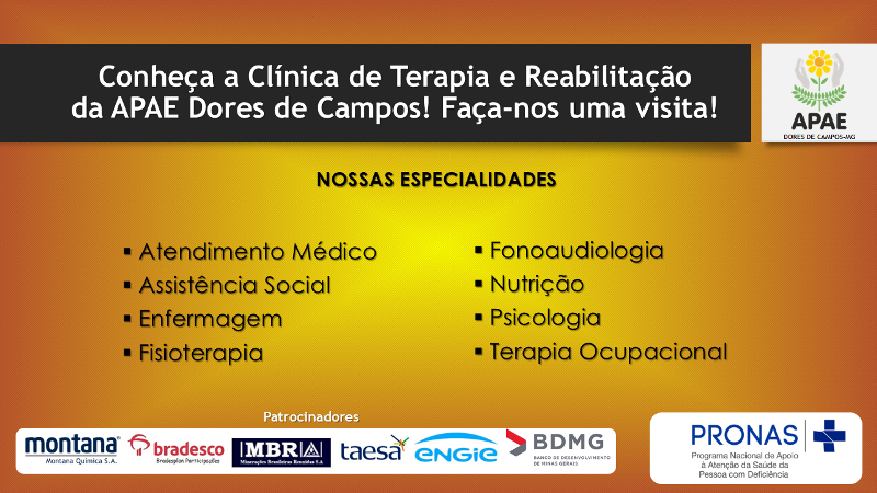 Entre os meses de março e dezembro de 2019, estão sendo publicadas mensalmente matérias educativas sobre saúde para a comunidade de Dores de Campos. O projeto Comunicação e Educação em Saúde, consiste em fornecer informações sobre síndromes, transtornos e doenças que podem surgir em bebês e crianças pequenas. As temáticas serão desenvolvidas pelos profissionais de saúde da Clínica de Terapia e Reabilitação da APAE Dores de Campos, e publicadas no Portal Dores de Campos pelo seu Editor-chefe, jornalista Ricardo Arruda.
