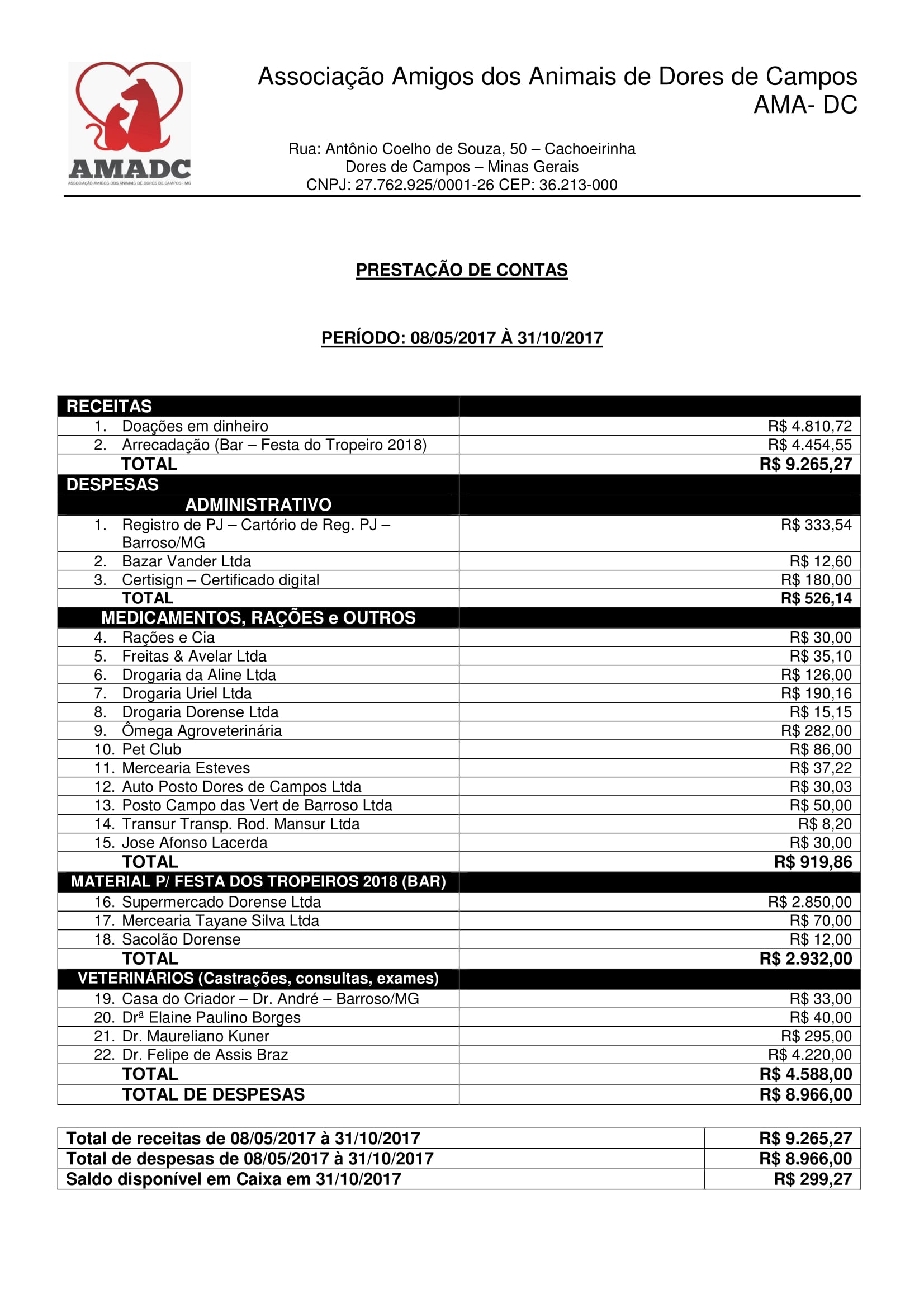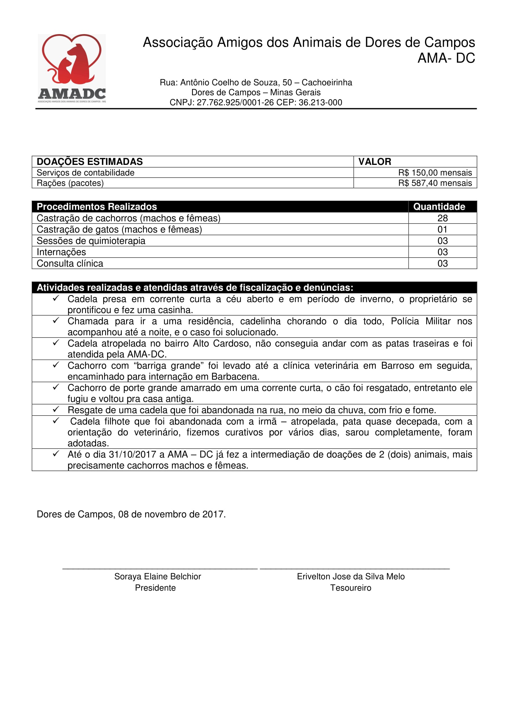 A Associação Amigos dos Animais de Dores de Campos enviou para a nossa reportagem, a prestação de contas da entidade equivalente ao período em que o CNPJ foi criado, entre os meses de maio e outubro deste ano. O documento tem a assinatura digital da presidente Soraya Elaine Belchior e do tesoureiro, Erivelton José da Silva Melo.