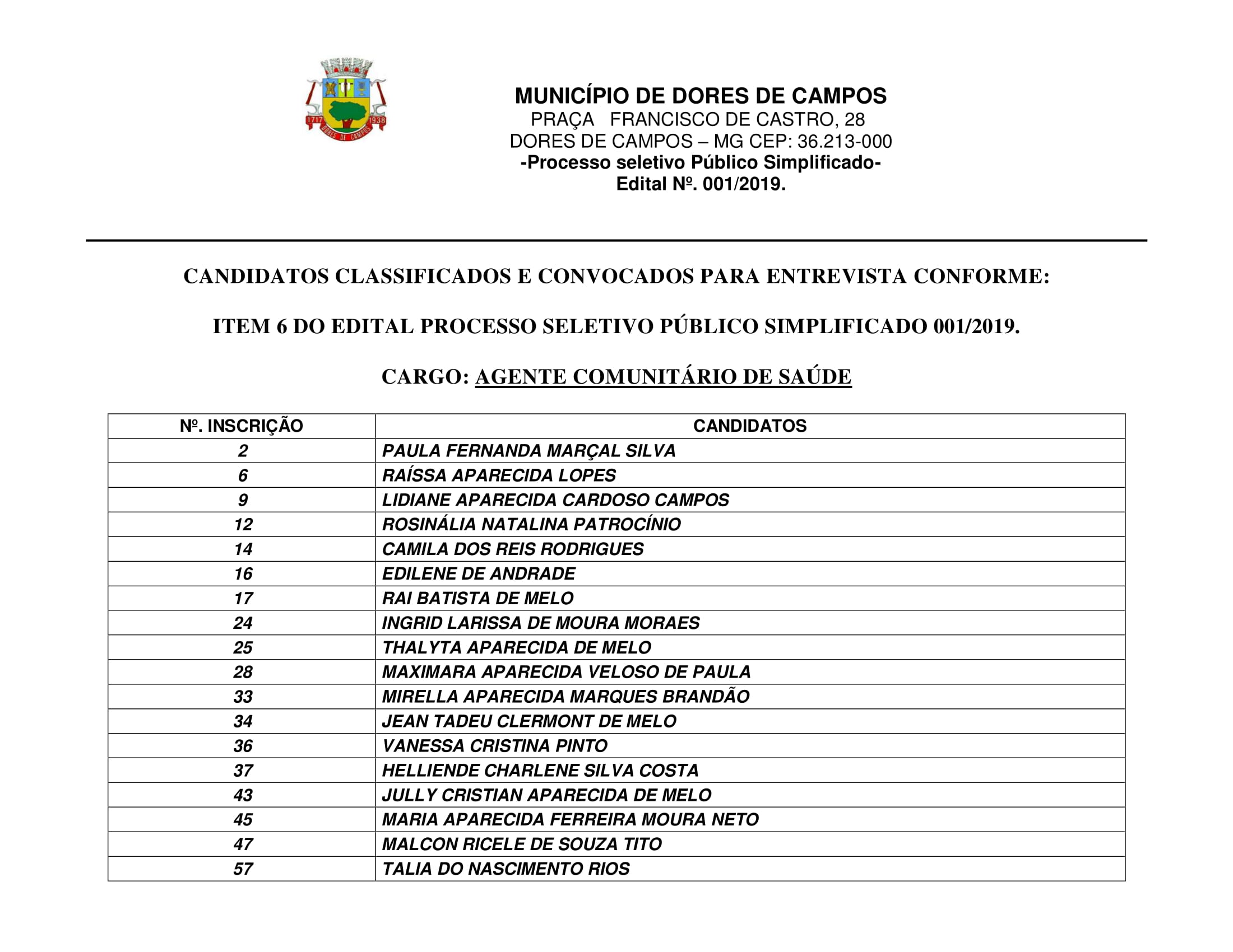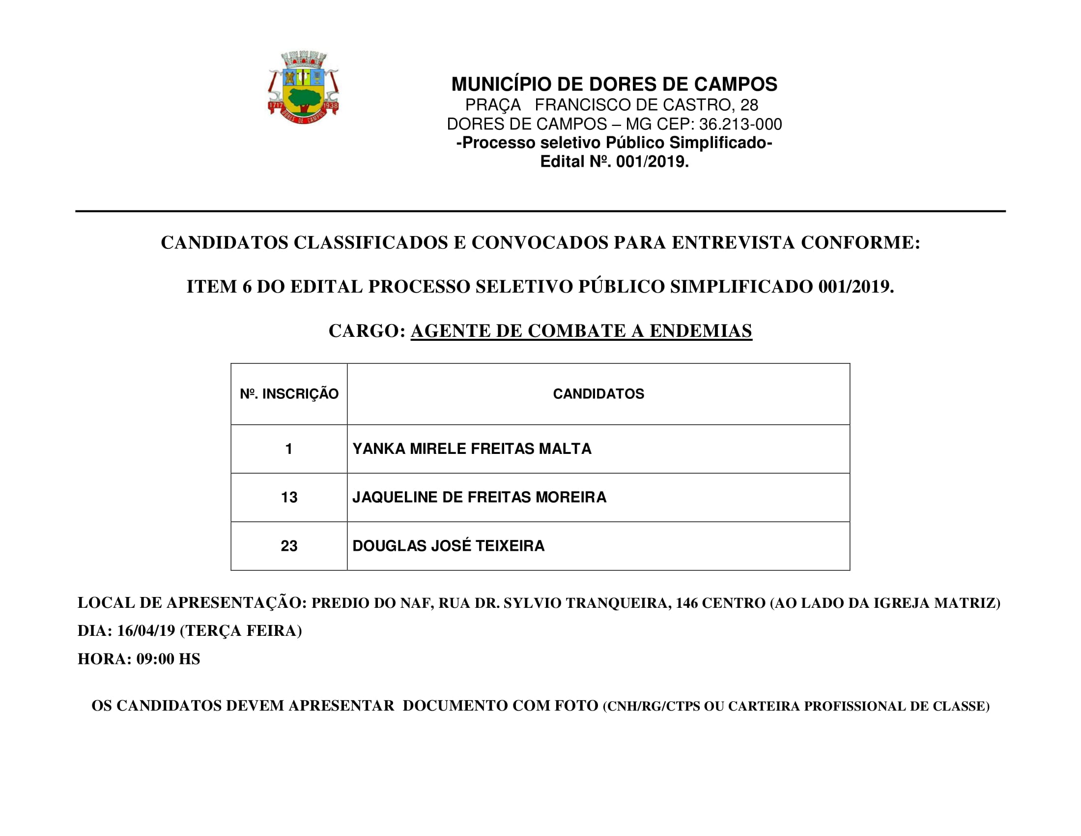 A Prefeitura Municipal de Dores de Campos divulgou a relação dos candidatos classificados e convocados para a entrevista individual do Processo Seletivo Simplificado 01/2019 da Secretaria Municipal de Saúde. Todos deverão comparecer às nove horas da manhã no prédio do NAF na rua Nova, quando estão em disputa cinco cargos de Agente Comunitário de Saúde e cinco de Agente de Combates a Endemia. Atenção! É obrigatório a apresentação de um documento oficial com foto: