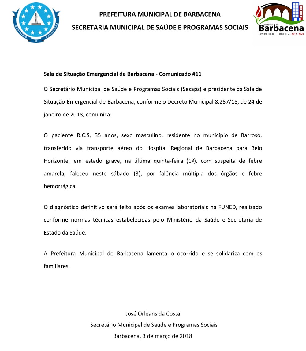 De acordo com a nota assinada pelo secretário municipal de Saúde e Programas Sociais e presidente da Sala, José Orleans da Costa, o paciente ficou internado no Hospital Regional de Barbacena até ser transferido para um hospital da capital mineira na última quarta-feira (28/02). O paciente teve falência múltipla dos órgãos e febre hemorrágica.