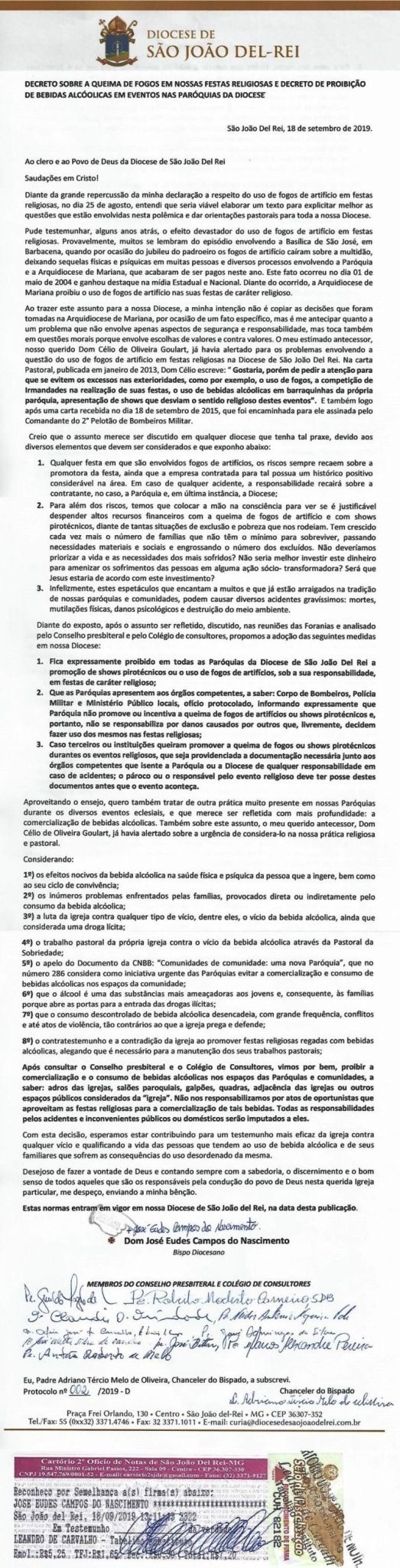 Na manhã desta quarta-feira (18) o bispo diocesano de São João del Rei, Dom José Eudes Campos do Nascimento, do qual pertence a Paróquia de Nossa Senhora das Dores, se reuniu com os membros do Conselho Presbiteral e Colégio de Consultores para a elaboração e publicação de um decreto sobre a queima de fogos de artifícios e a venda de bebidas alcoólicas em eventos e festas religiosas da Diocese. No documento, o bispo explica de forma detalhada e apresenta diversos argumentos. Confira na íntegra: