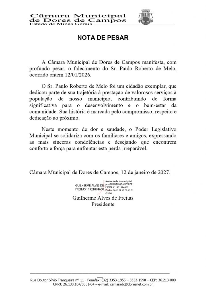 A Nota ressalta ainda que sua história foi marcada pelo compromisso, respeito e dedicação ao próximo, deixando um legado de serviços prestados e de exemplo à sociedade dorense. Neste momento de dor e saudade, o Poder Legislativo Municipal se solidarizou com familiares e amigos, expressando as mais sinceras condolências e desejando conforto e força para enfrentar a perda irreparável. O documento é assinada pelo presidente da Câmara Municipal de Dores de Campos, vereador Guilherme do Valtinho.