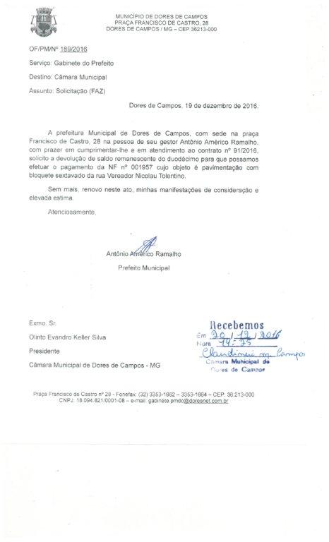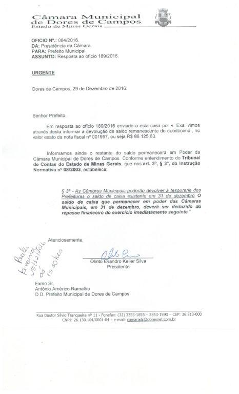 O presidente da Câmara de Dores de Campos, vereador Olinto (PP), devolveu R$ 86.125,63 para os cofres da Prefeitura, na tarde desta quinta-feira (29/12). Conforme o ofício 189/2016, enviado pela atual administração, o recurso serviu para pagar a empresa que realizou o calçamento da rua Vereador Nicolau Tolentino de Oliveira, no bairro Cachoeirinha.
