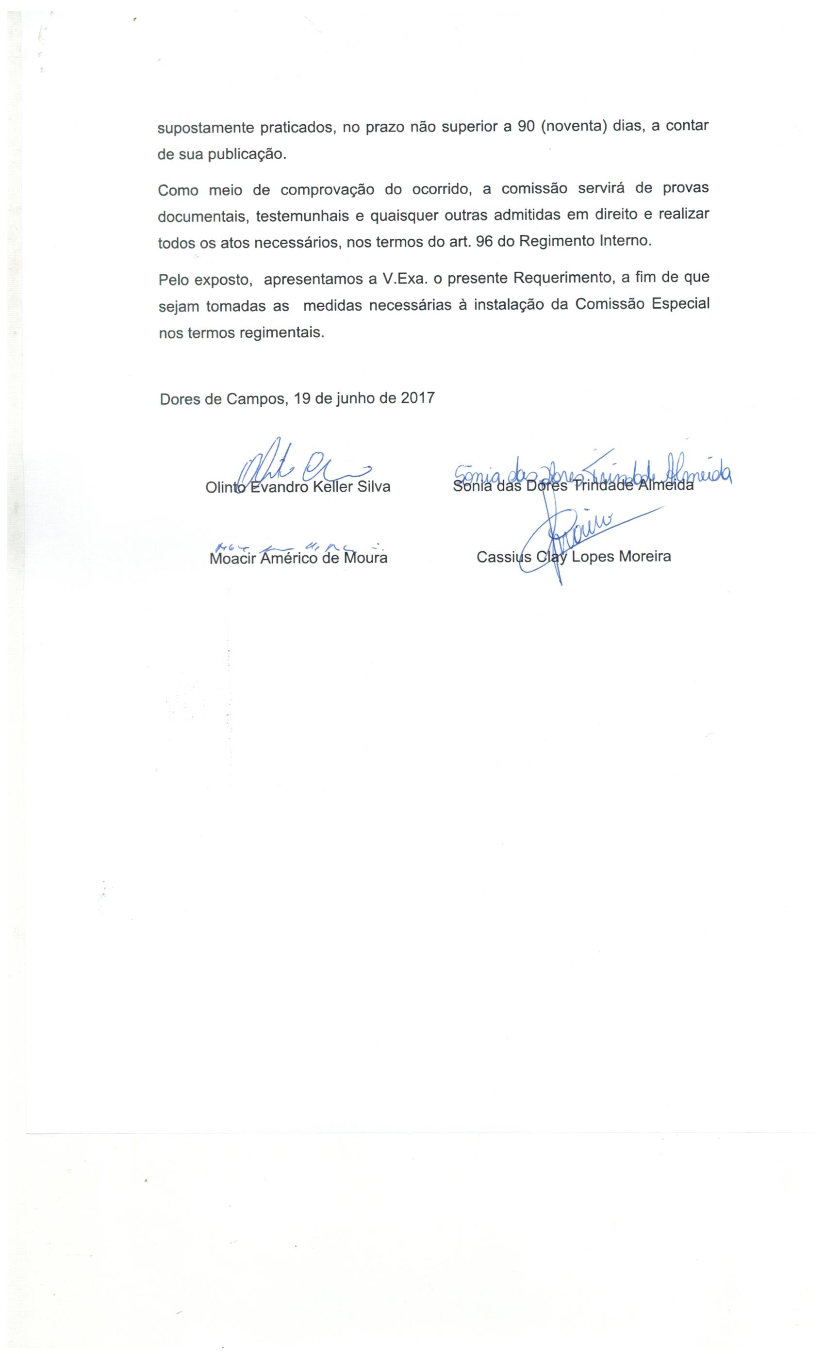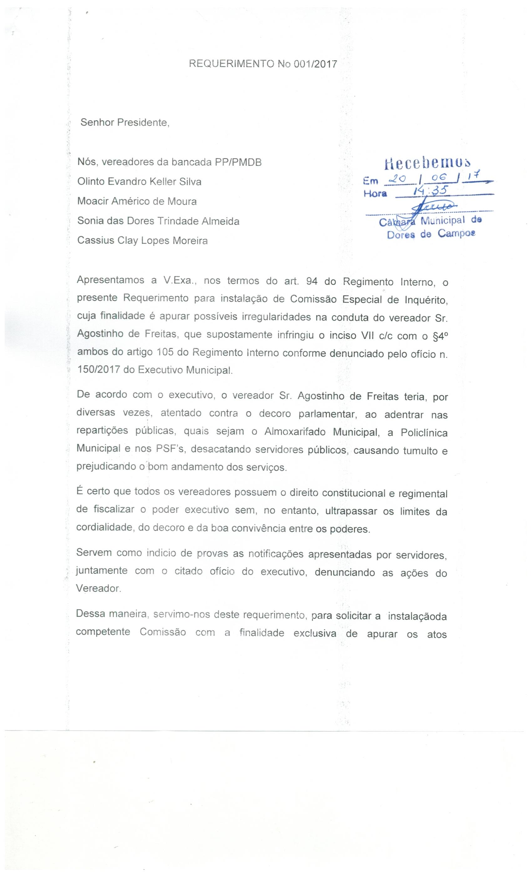 Os vereadores da bancada do PMDB e PP (Cássius, Soninha, Olinto e Cimerco), apresentaram o requerimento 01/2017 para a Criação da Comissão Especial de Investigação (CPI), para apurar possíveis irregularidades na conduta do vereador Agostinho da Darci (DEM) conforme denuncia apresentada pela Prefeitura Municipal de Dores de Campos, através do ofício 150/2017, assinado pelo prefeito Marcílio Cotta (PMDB).