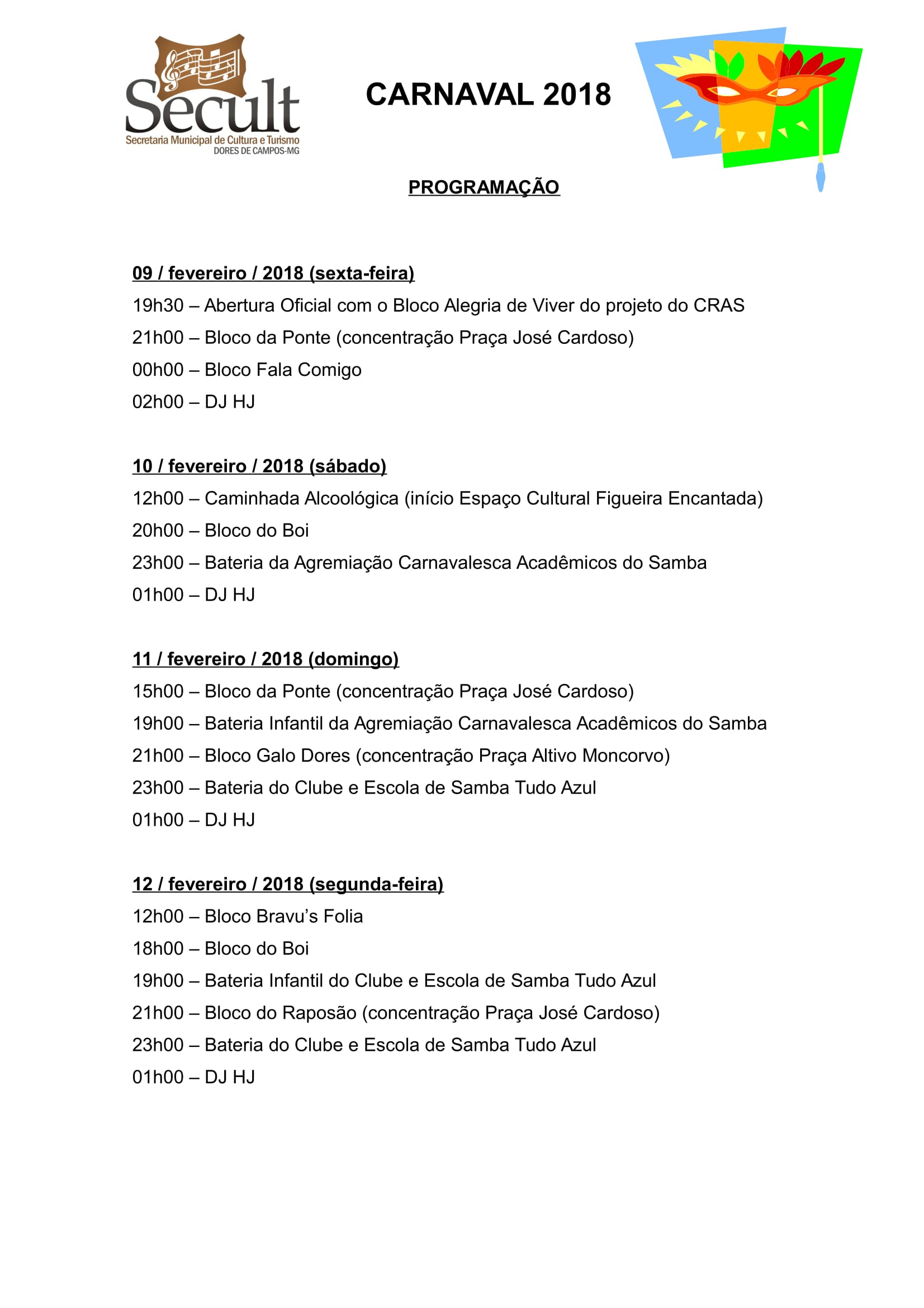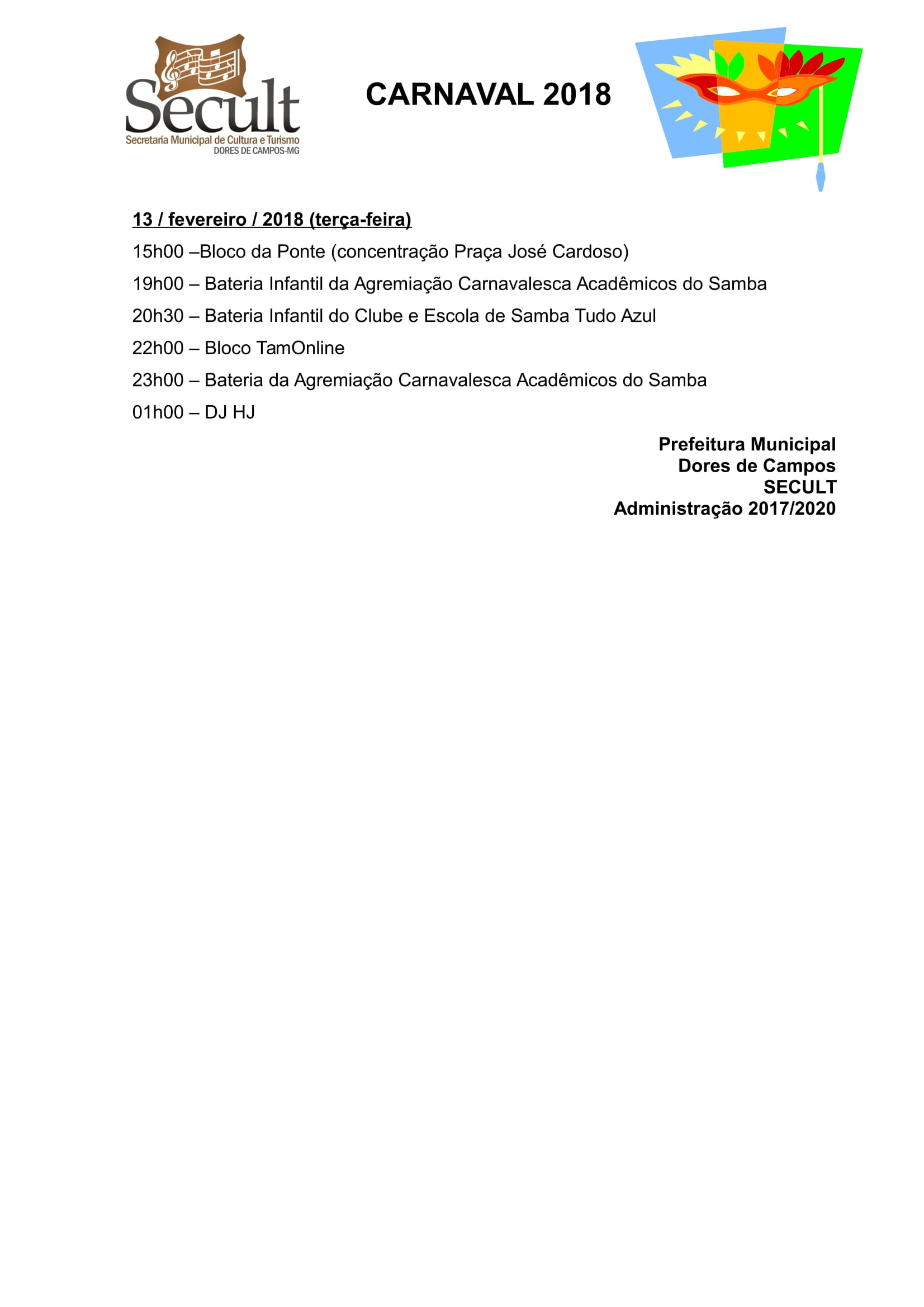 Veja a programação oficial do Carnaval 2018: