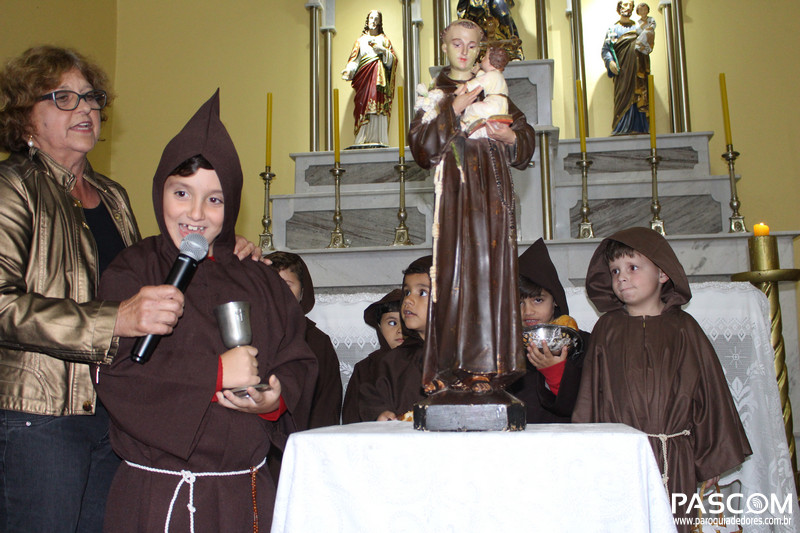 Comentou também sobre a riqueza de nossa igreja com tantos exemplos de santidade. O pároco também relatou a belíssima caminhada de Santo Antônio desde o seu nascimento… Terminando esse belo momento com uma bonita tradição das bênçãos dos pães que geram fartura em nossos lares e a coroação de Santo Antônio pelos meninos paroquianos.