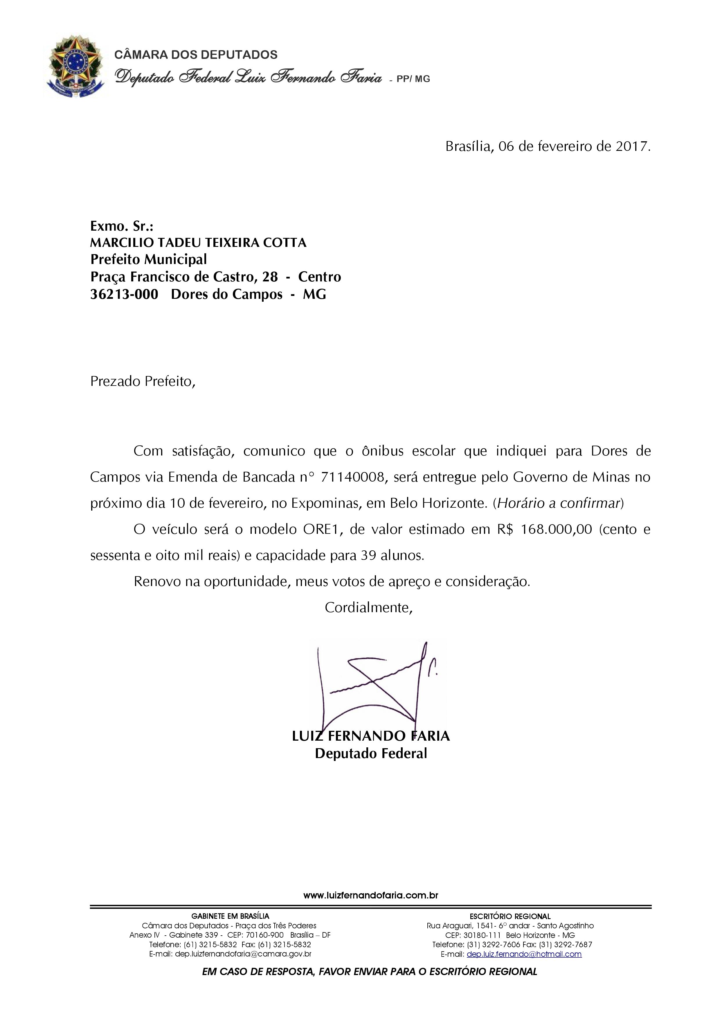 No final da manhã desta sexta-feira (10/02), o prefeito Marcílio Cotta (PMDB) recebeu das mãos do governador Fernando Pimentel (PT) a primeira grande conquista da sua administração: As chaves de um ônibus escolar zero Km para 39 alunos no valor de R$ 168 mil, através de emenda do deputado federal Luiz Fernando (PP). A cerimônia foi realizada na Cidade Administrativa, em Belo Horizonte, sede do Governo de Minas Gerais, e também contou com a presença do vice-prefeito Aguinaldo do Lado (PMDB), e da secretária estadual de educação, Macaé Evaristo. “É só o começo. Tenho apenas 40 dias de governo e as conquistas já estão chegando. A população dorense pode ter a certeza que estou trabalhando com muita responsabilidade e em breve apresentarei mais novidades”, afirmou o prefeito.