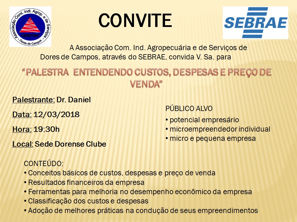 Nesta segunda-feira (12/03), a Associação Comercial, Industrial, Agropecuária e de Serviços de Dores de Campos (ACIDEC), em parceria com o SEBRAE, estará promovendo uma grande palestra com o tema: “Entendendo os custos, despesas e preço de venda”, com o consultor, doutor Daniel de Miranda Carvalho. O evento será na sede social do Dorense Clube, a partir das sete e meia da noite, tendo como público alvo os grandes empresários, assim como os Microempreendedores Individuais (MEI) e os micro e pequenos empresários. “Estamos preparando uma série de eventos para fortalecer as empresas de Dores de Campos. Teremos muitas outras novidades”, destacou o presidente da Associação, empresário Ronaldo Montes.