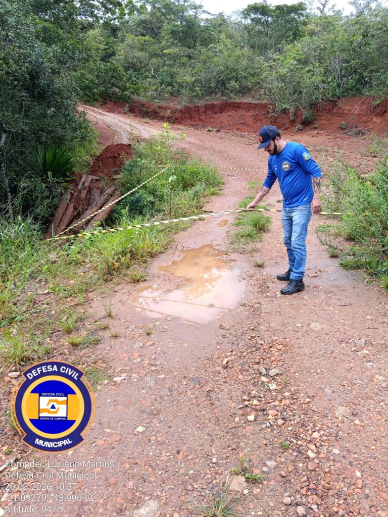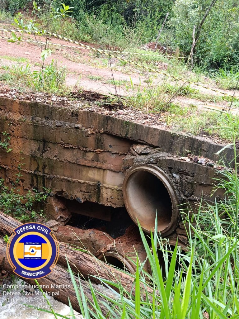 A Defesa Civil interditou, nesta sexta-feira (20/03), a ponte localizada no povoado do Matias, na zona rural de Dores de Campos, após parte da estrutura ceder em decorrência das fortes chuvas que atingem o município e toda a região do Campo das Vertentes. De acordo com informações da Defesa Civil, o acúmulo de água no solo comprometeu a base da ponte, provocando o rompimento de manilhas e o consequente desmoronamento de parte da estrutura. Há risco iminente de colapso total da ponte sobre o córrego.