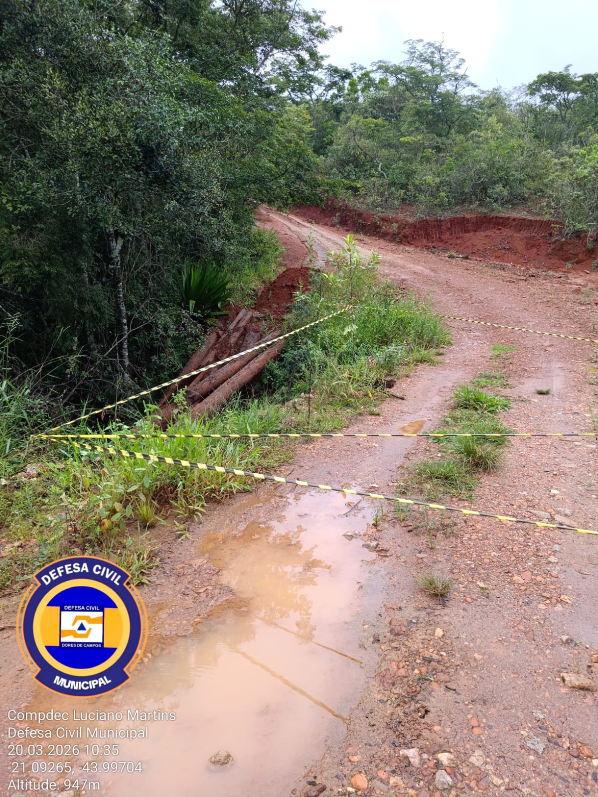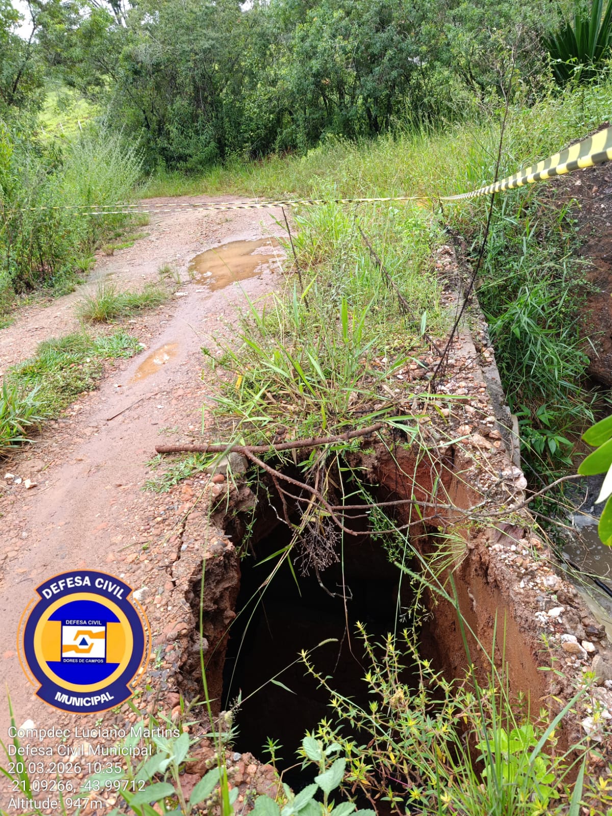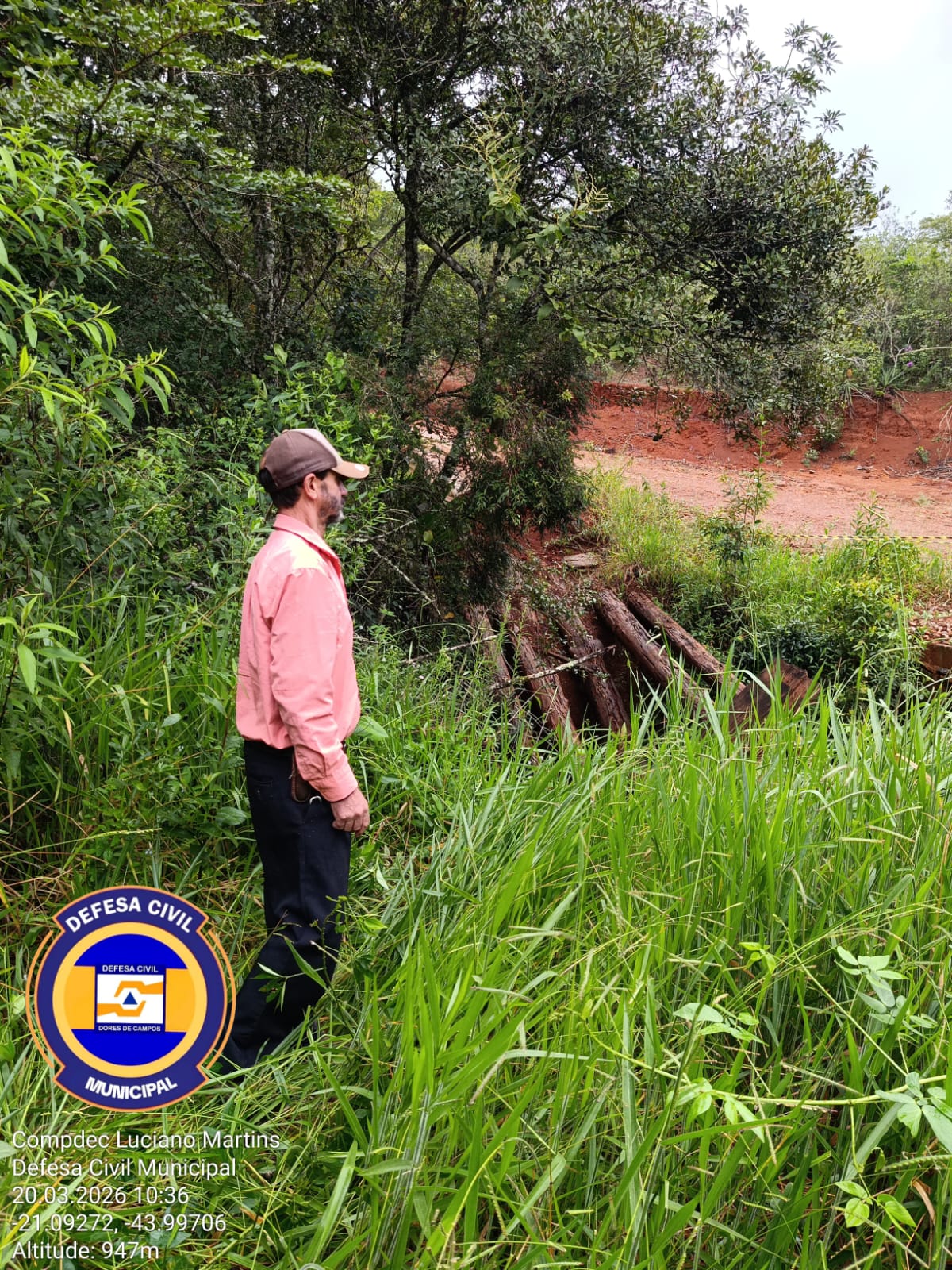 A Defesa Civil interditou, nesta sexta-feira (20/03), a ponte localizada no povoado do Matias, na zona rural de Dores de Campos, após parte da estrutura ceder em decorrência das fortes chuvas que atingem o município e toda a região do Campo das Vertentes. De acordo com informações da Defesa Civil, o acúmulo de água no solo comprometeu a base da ponte, provocando o rompimento de manilhas e o consequente desmoronamento de parte da estrutura. Há risco iminente de colapso total da ponte sobre o córrego.