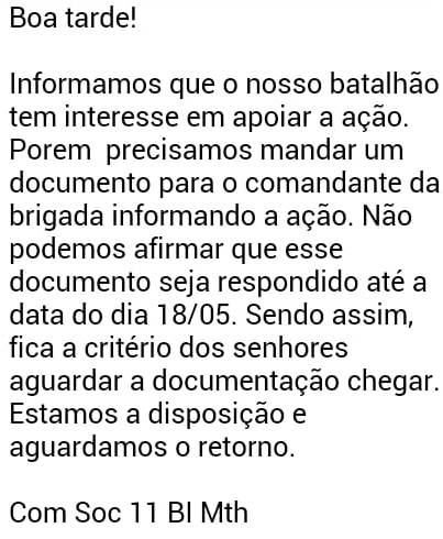 O Exército Brasileiro se interessou em apoiar o mutirão contra a Dengue em Dores de Campos no próximo sábado (18), mas depende de uma autorização da Brigada Militar e pode ser, que essa autorização não seja respondida até a data do evento, conforme o e-mail (leia abaixo) repassado para a Defesa Civil de Dores de Campos.