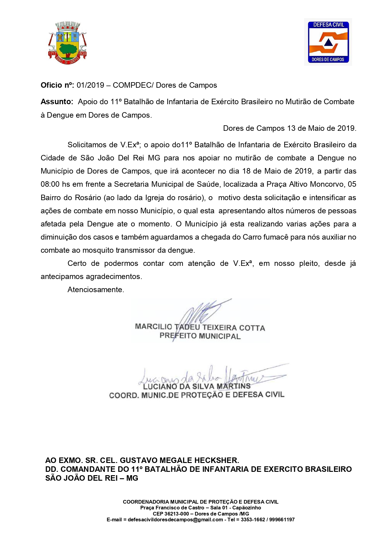 Diante do aumento considerável de casos de Dengue em Dores de Campos, a Defesa Civil solicitou a ajuda do Exército Brasileiro no mutirão que será realizado no próximo sábado (18) em vários bairros do município, como Cohab e Freitas, além de parte da zona rural. O ofício 01/2019 da Defesa Civil dorense foi enviado nesta segunda-feira (13) ao coronel Gustavo Megale HecKsher, comandante do Batalhão de São João Del Rei. Assinam o documento, o prefeito Marcílio Cotta (MDB) e o coordenador Luciano Martins.