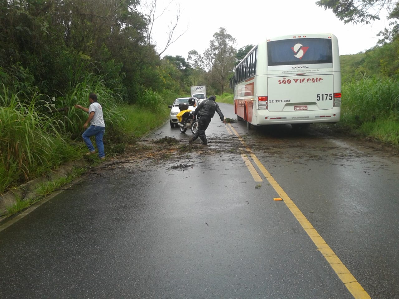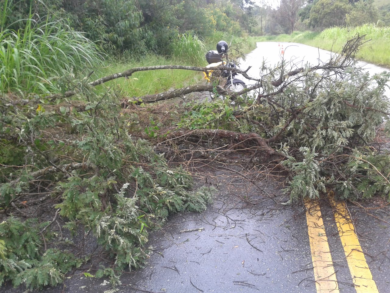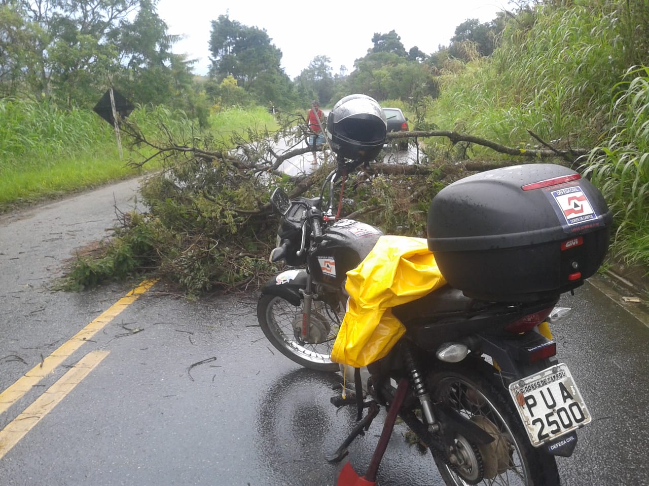 A forte chuva que caiu na tarde desta quarta-feira (26/12) derrubou uma árvore na rodovia entre Dores de Campos e Barroso. A Defesa Civil foi acionada e de acordo com o coordenador Luciano Martins, ele contou com o apoio de dois servidores da Prefeitura e de um motorista que trafegava pelo local. Com o uso de uma moto serra, eles fizeram o trabalho de remoção do tronco na região do sítio do empresário Marcelo Arruda, no trecho dorense da rodovia.