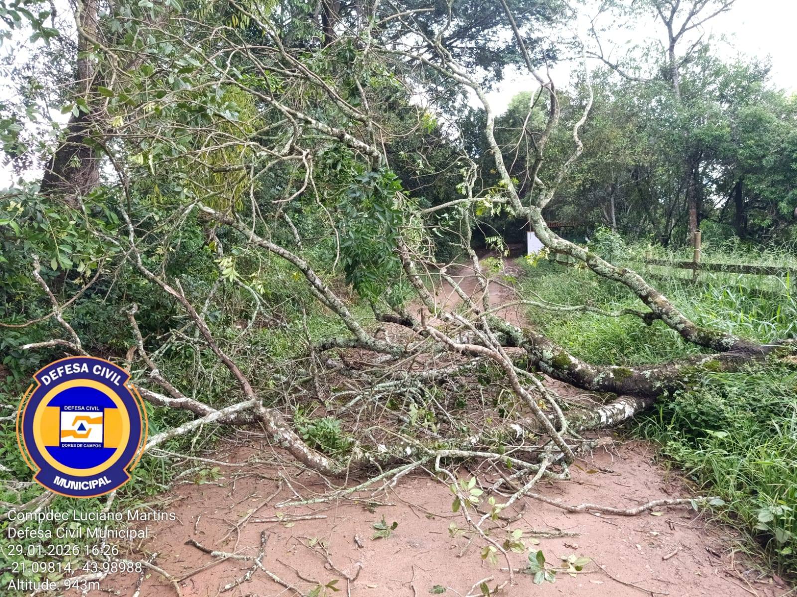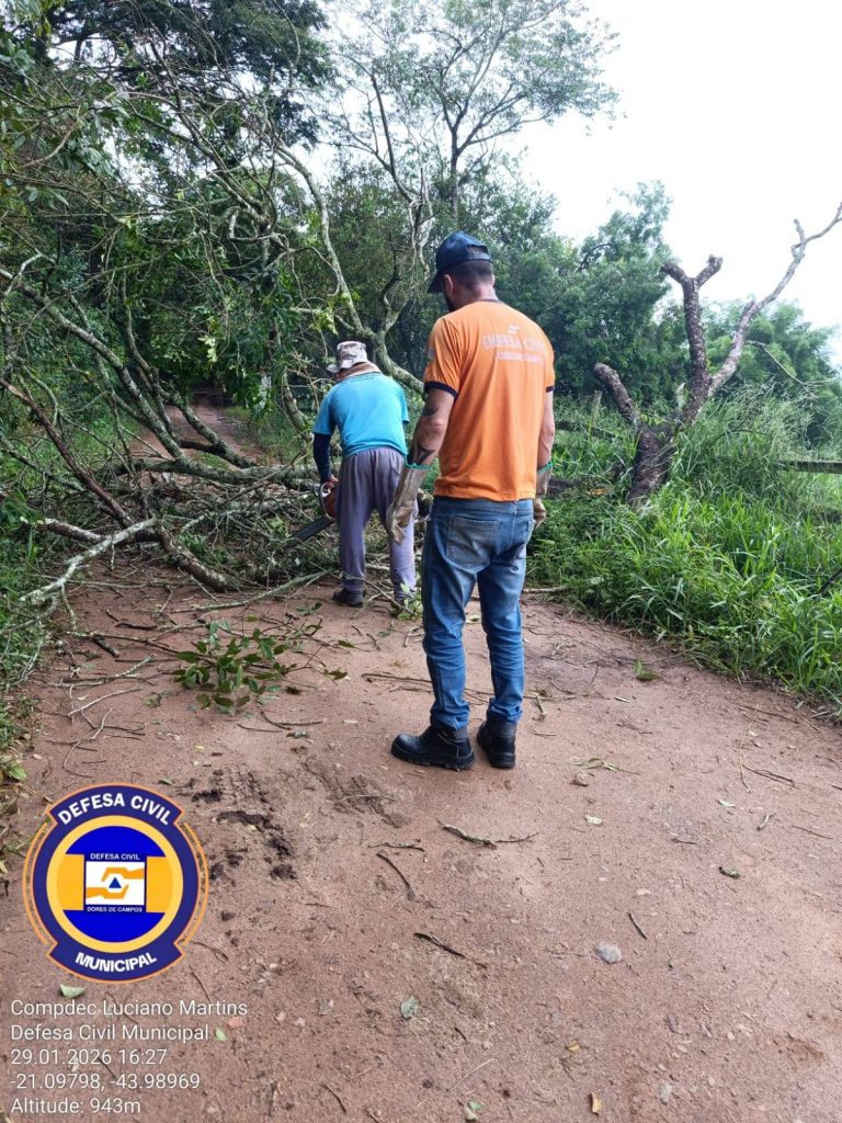 Na tarde desta quinta-feira (29/01) a Defesa Civil foi acionada para atender a uma ocorrência de queda de árvore na estrada da Lagoa Seca, na zona rural de Dores de Campos. A ação contou com o apoio de servidores da Secretaria Municipal de Obras. O trabalho foi realizado com segurança e agilidade, garantindo a remoção da árvore que obstruía a via. Após a intervenção, a estrada foi liberada, restabelecendo o acesso e a segurança para os moradores e demais usuários da via.