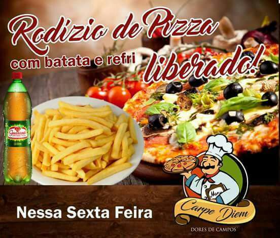 Prepara-se para um delicioso Rodízio de Pizzas com batata frita e refrigerante liberados. Nesta sexta-feira (11/08) a Pizzaria Carpe Diem espera por você e sua família, na avenida Inácio Silva, a partir das sete horas da noite. Não perca e venha saborear as melhores e mais gostosas pizzas da região, sempre com o melhor atendimento!