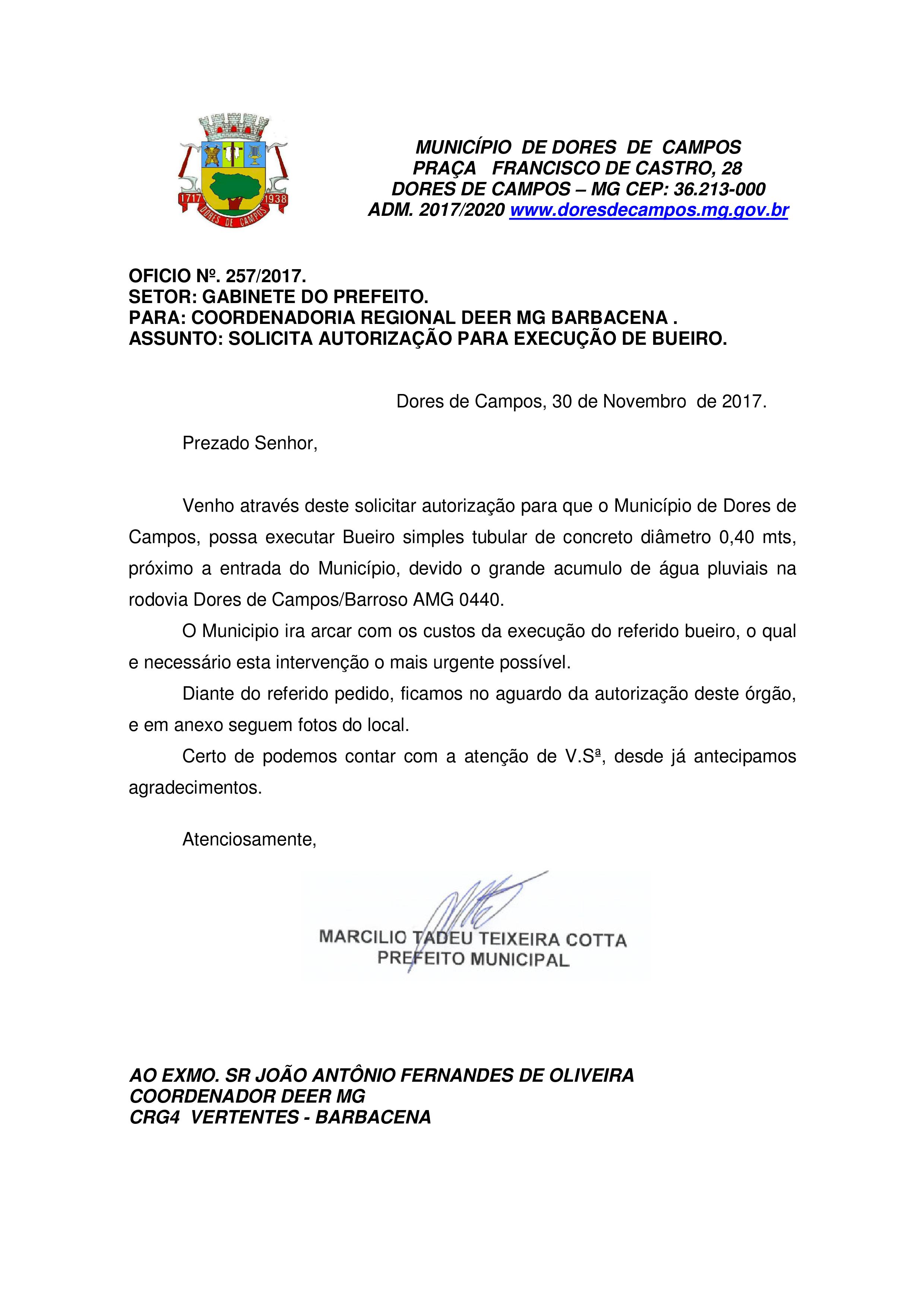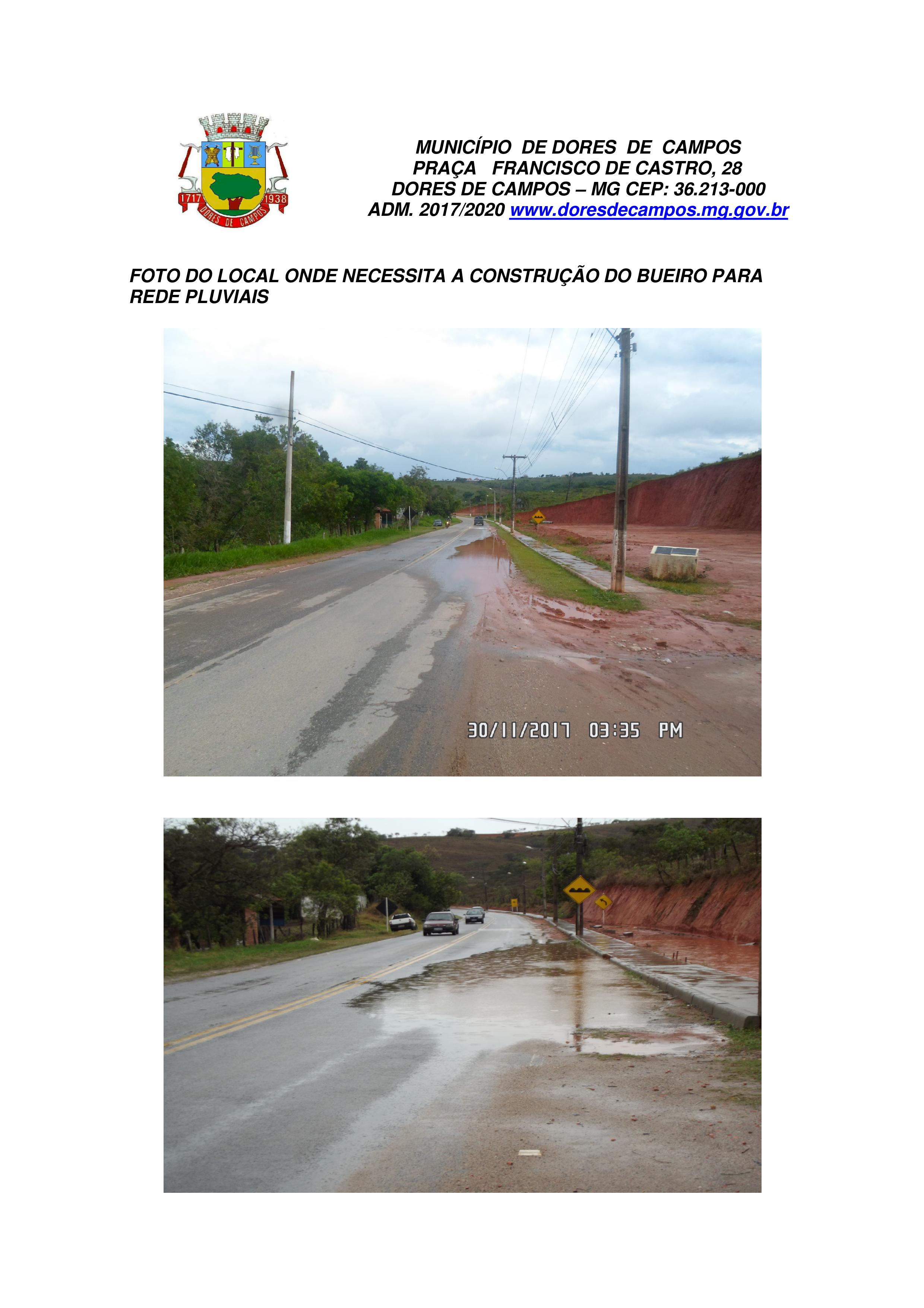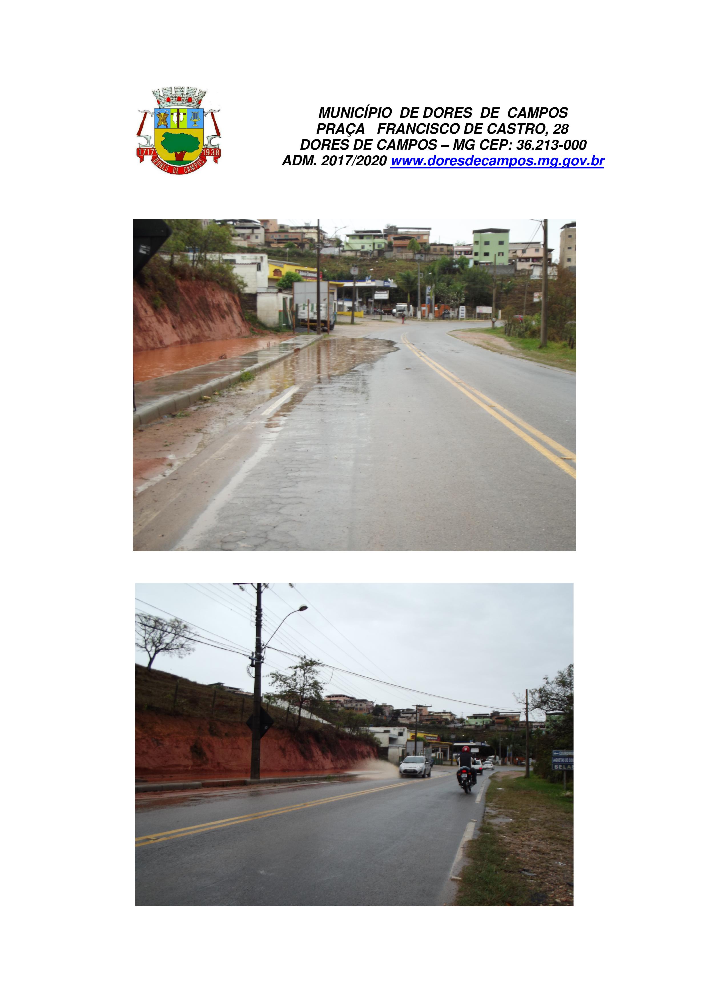 A Prefeitura Municipal de Dores de Campos informou que no último dia 30 de novembro, enviou um Ofício ao DER/MG de número 257/2017, pedindo autorização para construir um bueiro para aumentar a vazão da água. Até o momento, não houve qualquer resposta.