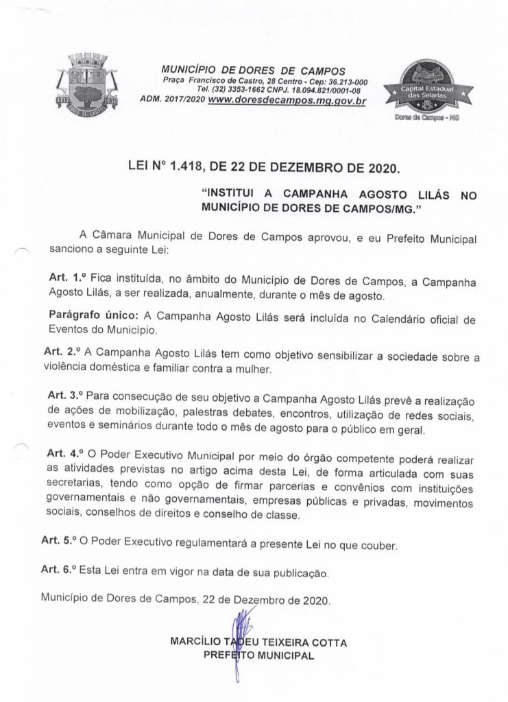 A lei foi sancionada pelo então prefeito Marcílio Cotta, hoje vereador, e determina que a campanha seja realizada anualmente durante todo o mês de agosto, com o objetivo de sensibilizar a sociedade sobre a violência doméstica e familiar contra a mulher.