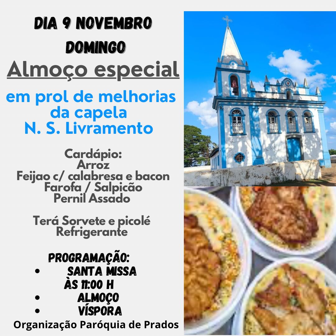 No segundo domingo (09/11) do mês de novembro, a comunidade católica de Prados realiza um almoço especial em prol das melhorias na Capela de Nossa Senhora do Livramento. O evento é uma iniciativa da Paróquia de Prados e promete reunir fiéis e moradores em um dia de confraternização e solidariedade.