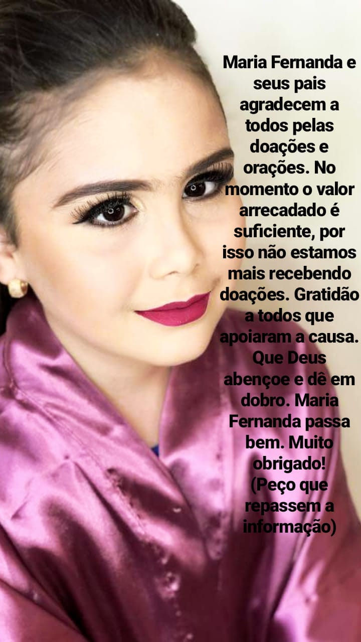 Diante da grande solidariedade da população dorense e também das cidades vizinhas, a família da jovem Maria Fernanda (12 anos) enviou neste domingo (02/09), um agradecimento especial pelas doações e orações de todos. Segundo a família, o valor arrecadado é suficiente, por isso não estão recebendo novas doações. “Gratidão a todos que apoiaram a causa. Que Deus abençoe e dê em dobro. A Maria Fernanda está passando muito bem”, finalizou o comunicado.