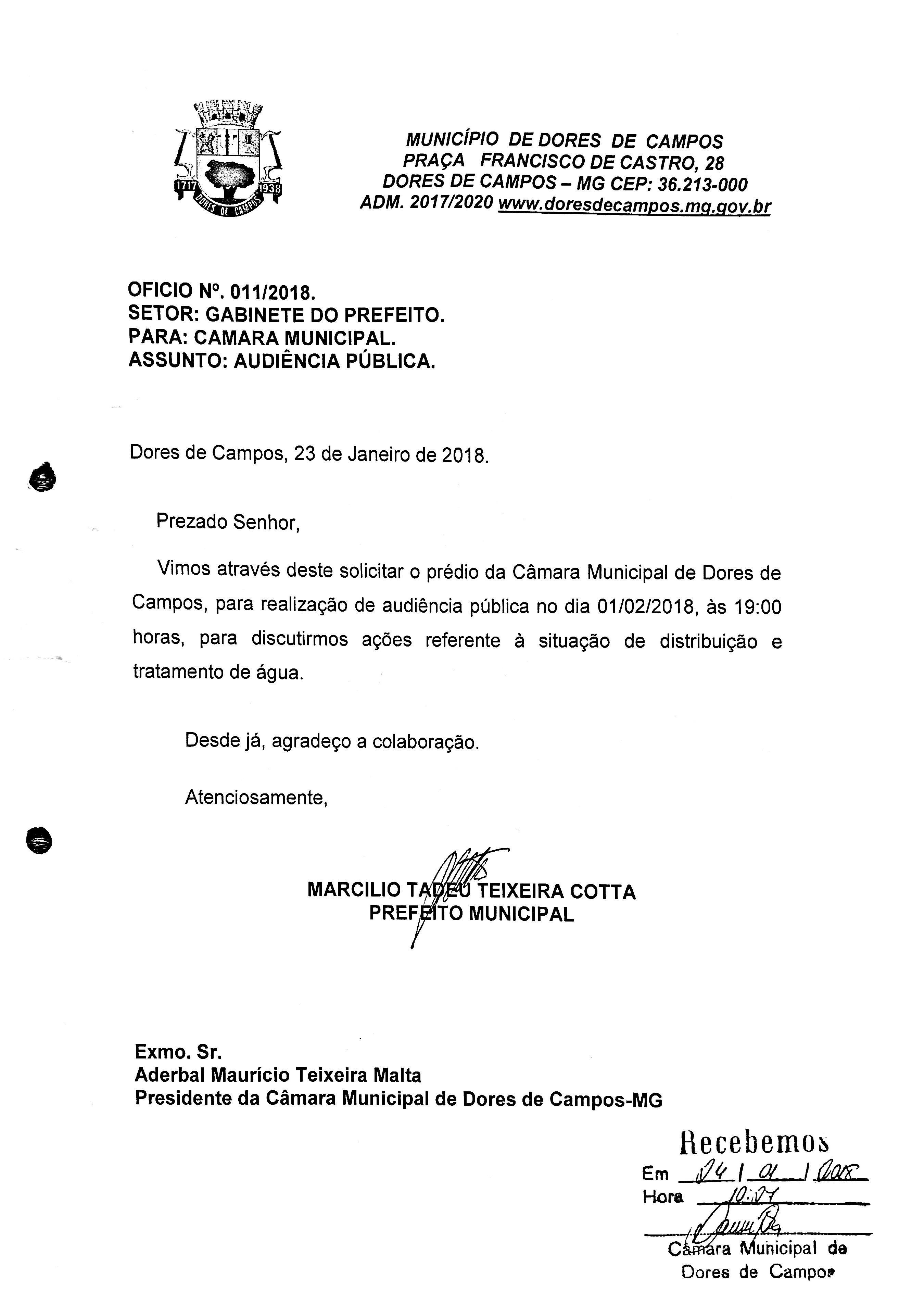 O tratamento e a distribuição da água em Dores de Campos serão debatidos nesta quinta-feira (01/02), a partir das sete horas da noite no Plenário da Câmara Municipal, conforme o ofício encaminhado pelo prefeito Marcílio Cotta (MDB) ao presidente da Casa, vereador Bal do Carlos Heleno (PT). “É uma excelente oportunidade da população dorense poder opinar sobre a situação da água”, destacou o prefeito. “Espero que a Câmara fique lotada. É um assunto de grande importância para a nossa comunidade”, enfatizou o vereador.