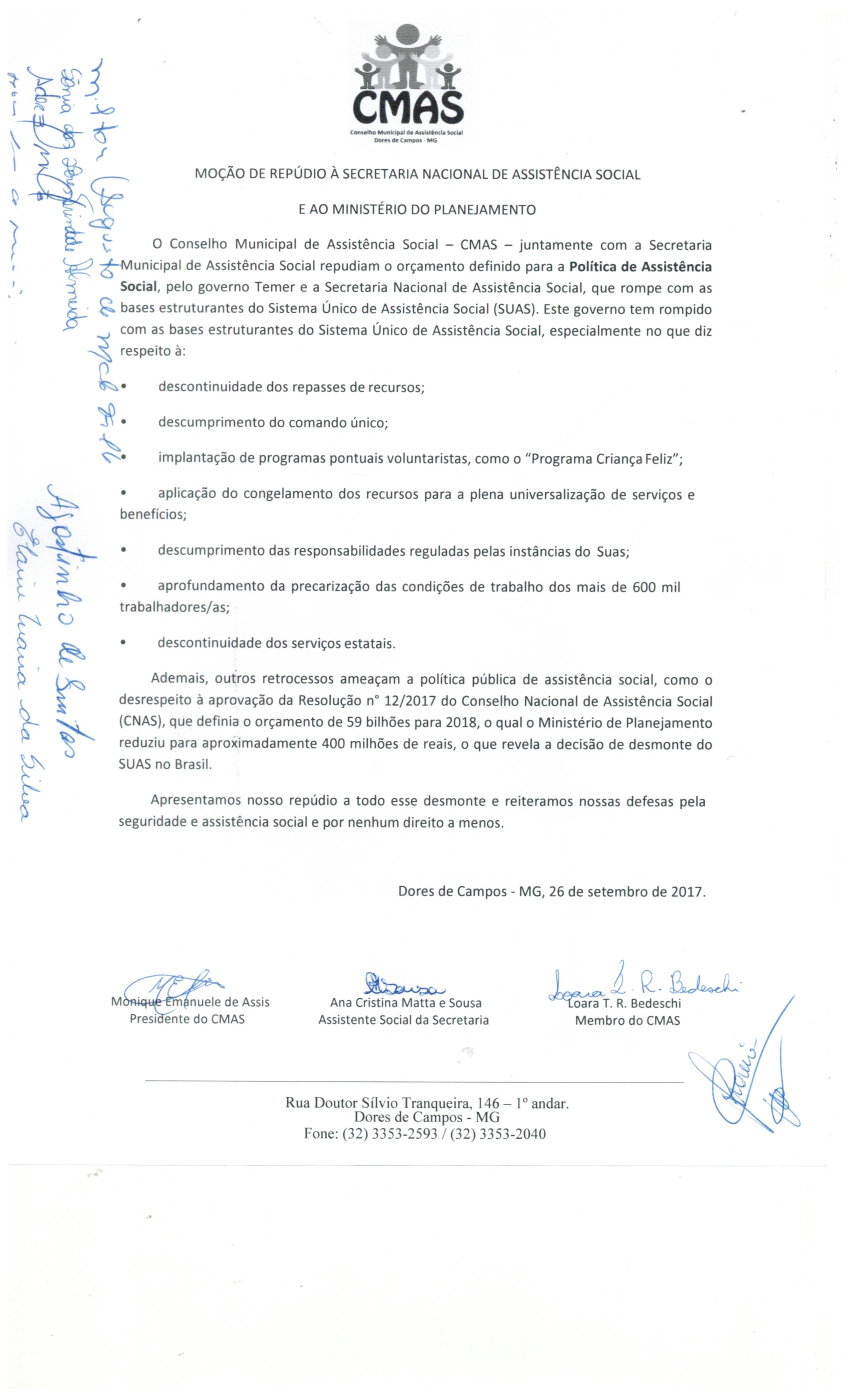 Diante dos cortes que o presidente Michel Temer (PMDB) pretende fazer no Orçamento da Assistência Social no ano de 2018 em todo o Brasil, membros do Conselho Municipal de Assistência Social de Dores de Campos participaram da reunião dos vereadores na última terça-feira (26/09) e leram em Plenário, uma Moção de Repúdio que será enviada para Brasília. Na oportunidade, todos os vereadores criticaram a medida do governo e também assinaram o documento.