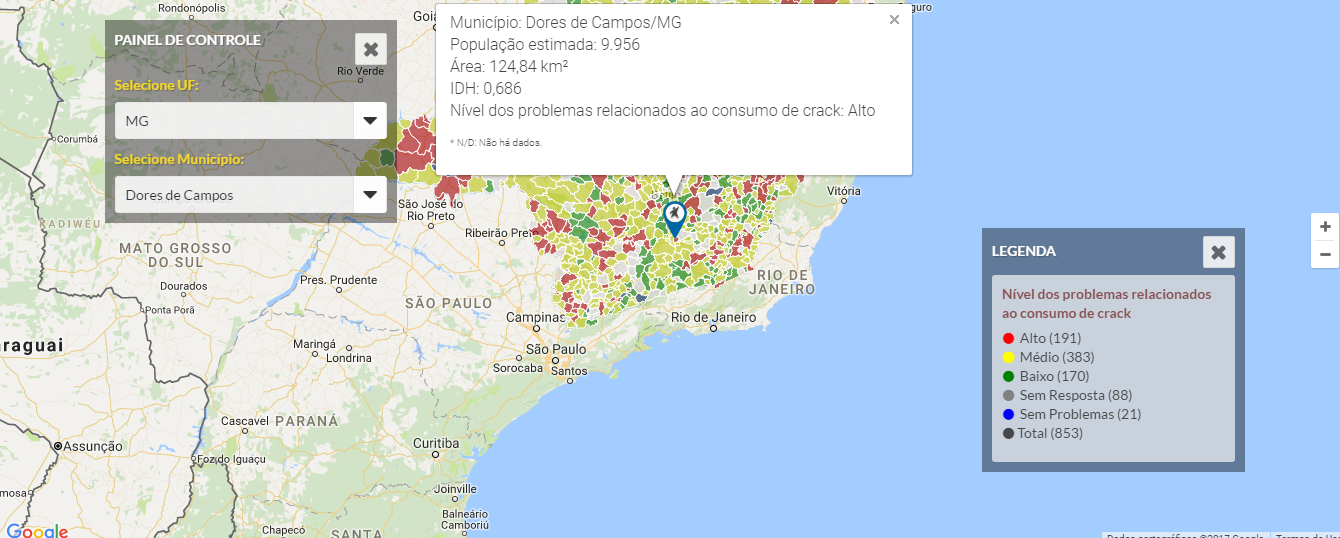 Dos 853 municípios de Minas Gerais, 191 estão no vermelho, no alto risco de consumo de crack, onde Dores de Campos está enquadrado. Outros 383 municípios estão no amarelo, com médio risco, caso de Barroso, Barbacena, São João Del Rei e Prados.