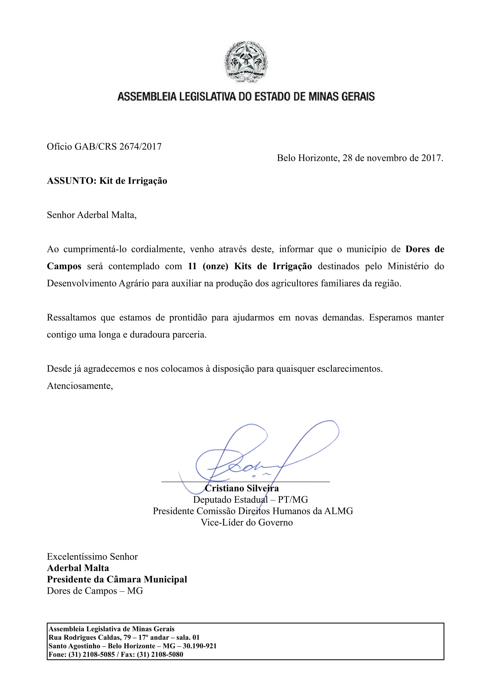 Nesta terça-feira (28/11) o deputado estadual Cristiano Silveira (PT) enviou dois ofícios para os vereadores Bal do Carlos Heleno (PT) e Soninha do Caxambu (PMDB), informando a liberação de 11 Kits de Irrigação destinados pelo Ministério do Desenvolvimento Agrário para auxiliar na produção dos agricultores familiares de Dores de Campos. De acordo com o presidente da Câmara, vereador Bal (PT), para a liberação destes benefícios, ele contou com a colaboração da vereadora do PMDB que mora na zona rural e conhece bem de perto, as reais necessidades dos trabalhadores do campo. “Agradeço ao nosso presidente da Câmara e ao deputado estadual Cristiano Silveira, que com tanto carinho e empenho, olhou para o povo tão sofrido da zona rural. Não tenho qualquer dúvida, que esses Kits irão fazer a diferença”, destacou a vereadora Soninha (PMDB).