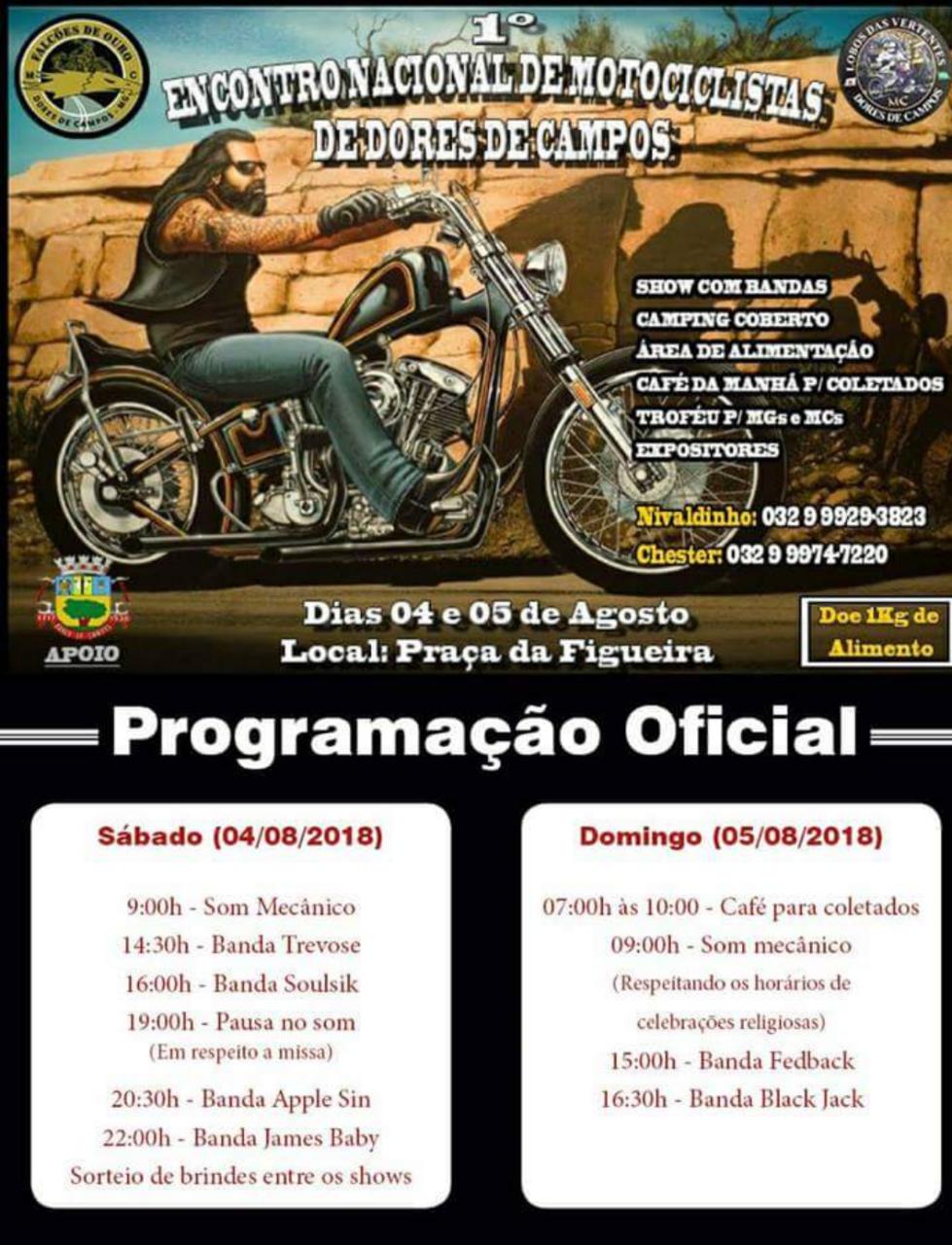 Dores de Campos será literalmente invadida neste final de semana, com o Primeiro Encontro Nacional de Motociclistas que será realizado no Espaço Cultural da Figueira Encantada com uma programação bastante intensa, tanto no sábado (04/08) quanto no domingo (05/08). O evento é organizado pelos Moto Clubes Lobos das Vertentes e Falcões de Ouro, com o apoio da Prefeitura, através da Secretaria Municipal de Cultura e Turismo.