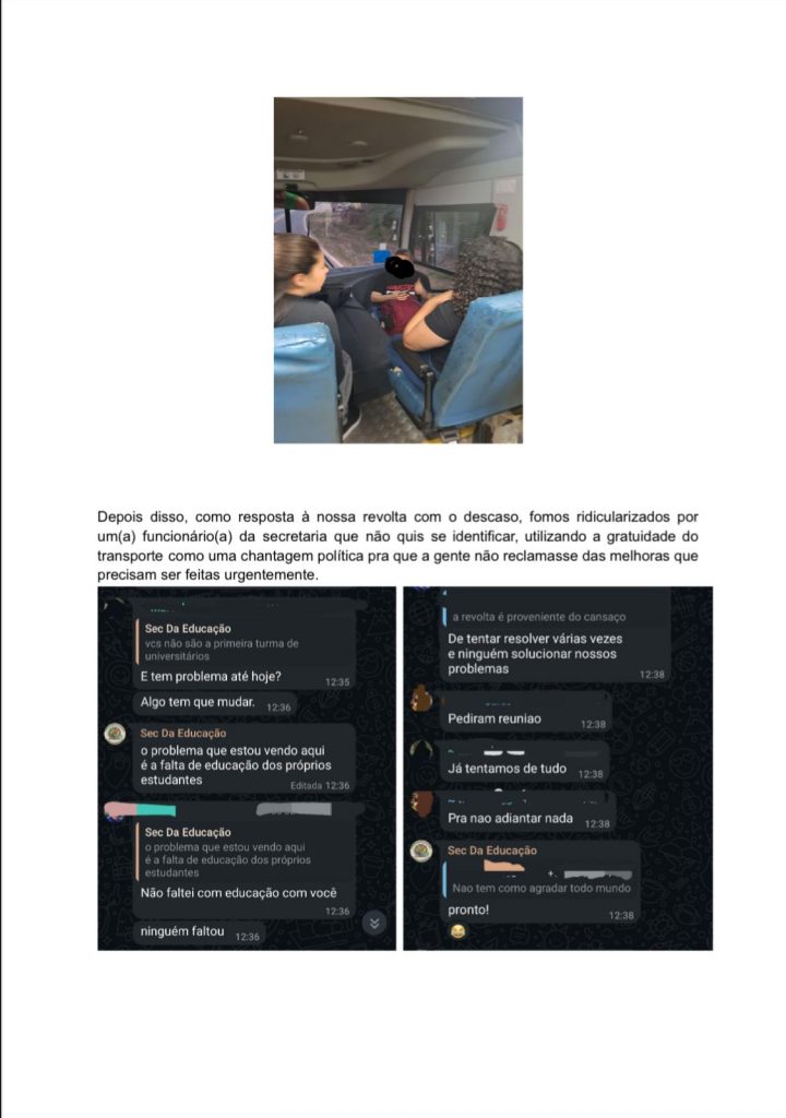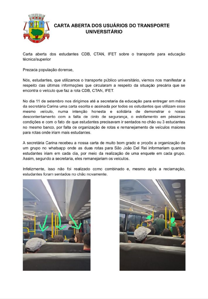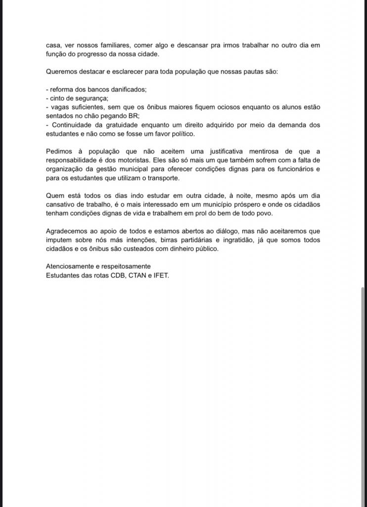 Na tarde desta quarta-feira (15/10), um grupo de estudantes que utiliza a rota de transporte escolar que atende o CDB, o CTAN e o IFET enviou ao Portal Dores de Campos uma carta aberta dirigida à população dorense. No documento, os alunos explicam que o objetivo é esclarecer as tentativas de diálogo e as ações realizadas anteriormente em busca de melhorias no transporte. Segundo eles, a carta foi redigida para evitar interpretações equivocadas sobre as motivações da reclamação enviada ao Portal Dores de Campos no último dia 13 de outubro.