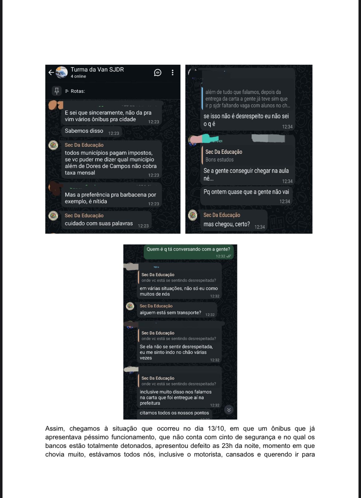 Na tarde desta quarta-feira (15/10), um grupo de estudantes que utiliza a rota de transporte escolar que atende o CDB, o CTAN e o IFET enviou ao Portal Dores de Campos uma carta aberta dirigida à população dorense. No documento, os alunos explicam que o objetivo é esclarecer as tentativas de diálogo e as ações realizadas anteriormente em busca de melhorias no transporte. Segundo eles, a carta foi redigida para evitar interpretações equivocadas sobre as motivações da reclamação enviada ao Portal Dores de Campos no último dia 13 de outubro.