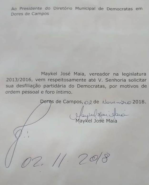 O ex-vereador Maykel da Caveira anunciou a sua desfiliação dos Democratas de Dores de Campos. Na tarde terça-feira (20/11) o político confirmou a informação para a nossa reportagem e também destacou que, por enquanto, não irá se filiar a nenhum outro partido. Ele também não confirmou será será candidato na eleição de 2020.