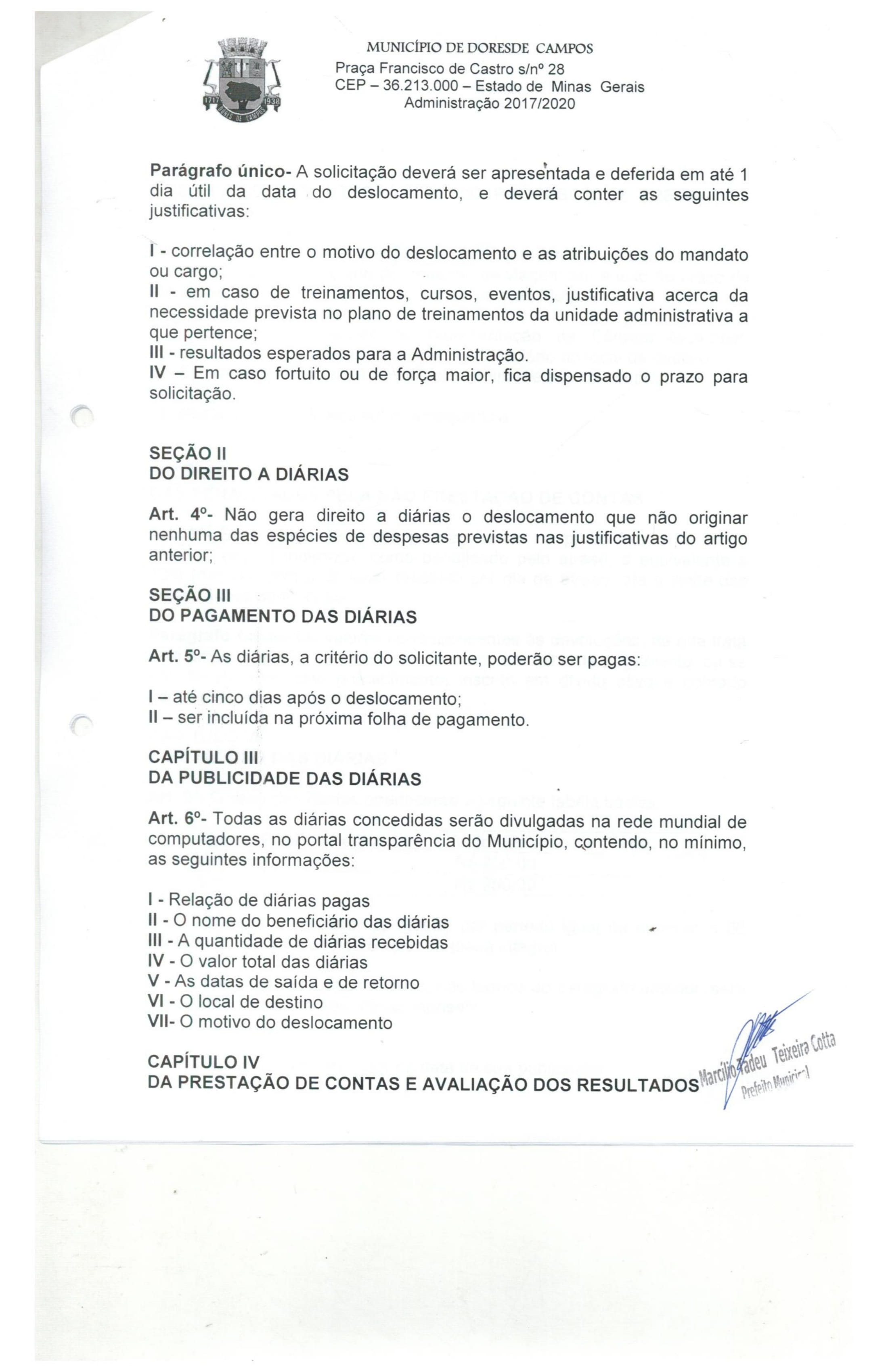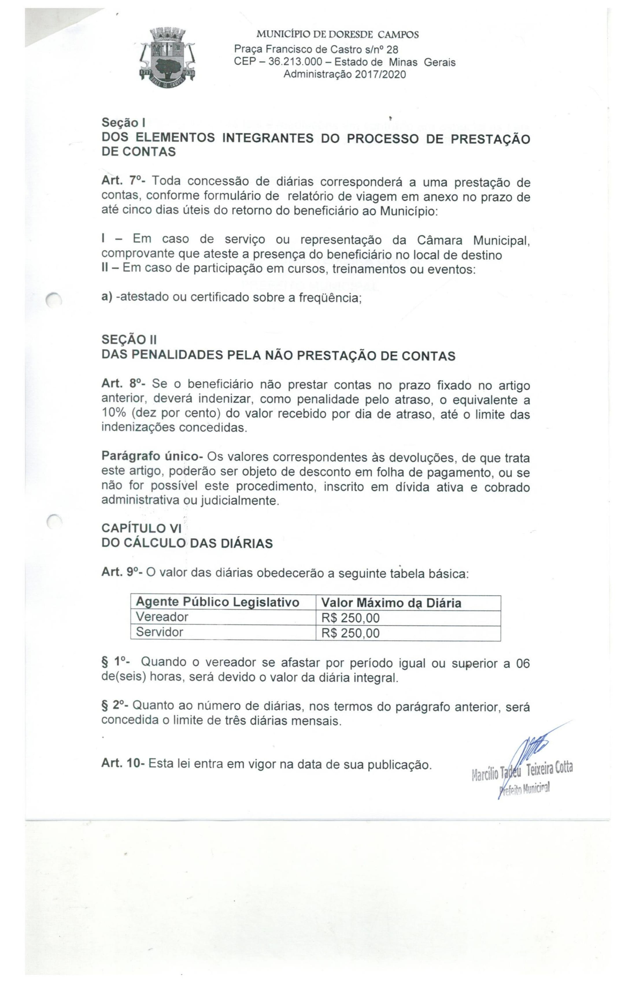 Com relação as diárias na Câmara Municipal de Dores de Campos, a assessoria jurídica da Casa respondeu que a Lei Municipal 1.341 de 22 de dezembro de 2017 normatizou os pagamentos. Na prática, cada vereador recebe o valor máximo de R$ 250,00 com um número limitado de apenas três diárias por mês, com as suas respectivas justificativas. A mesma regra também se aplica aos servidores da Câmara.