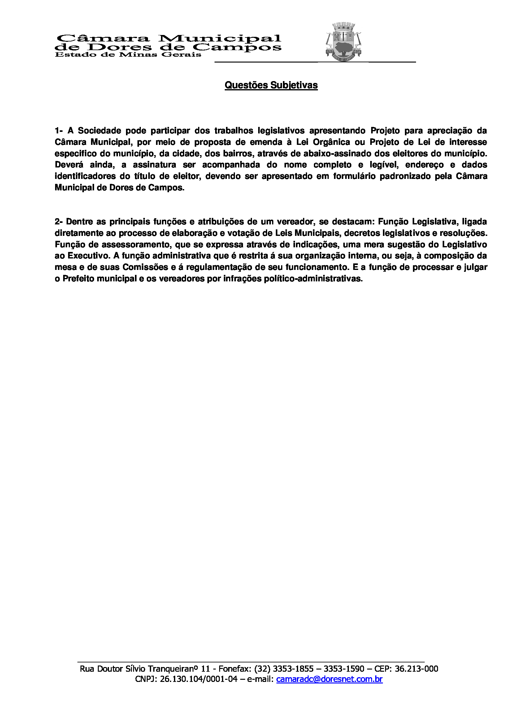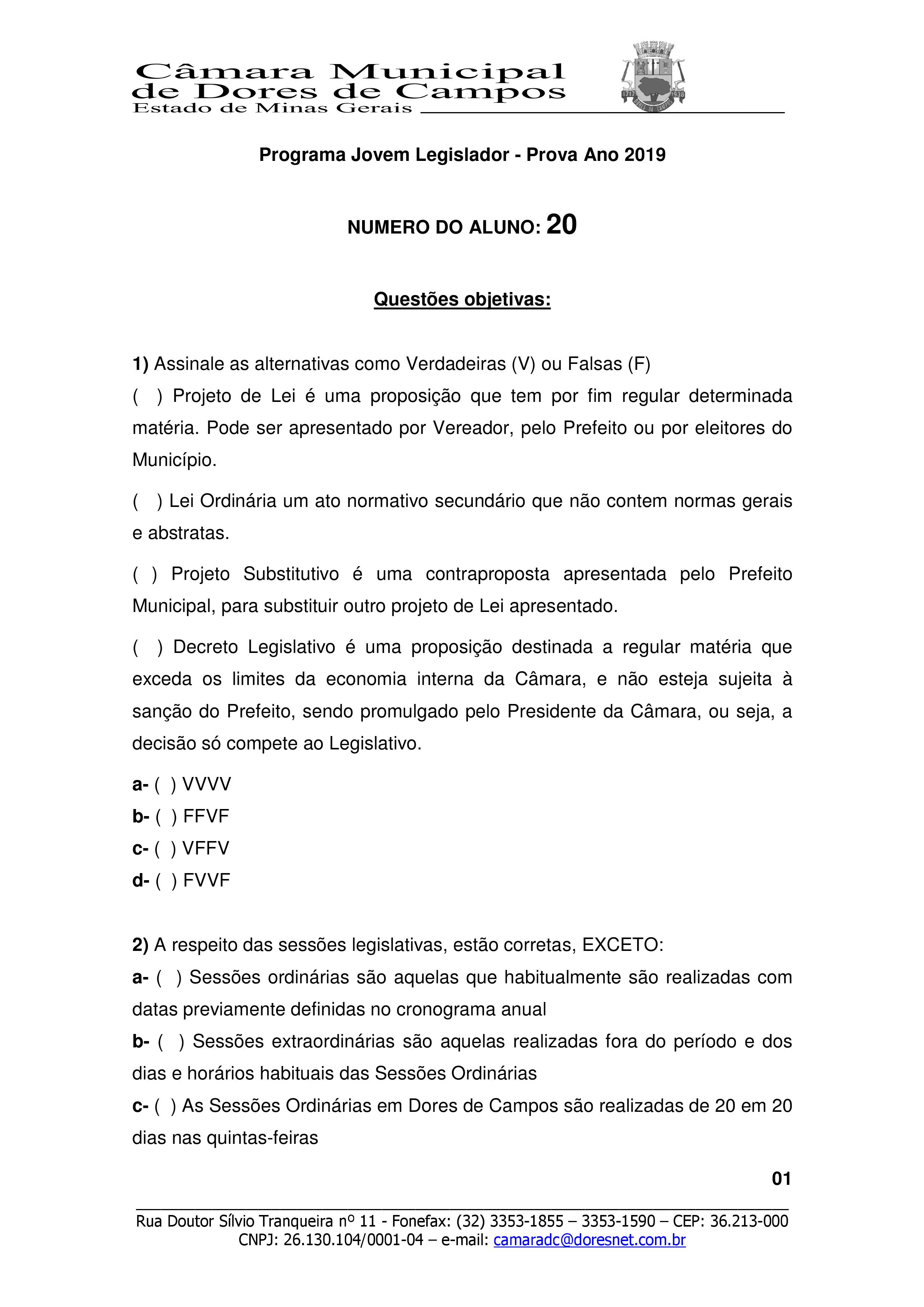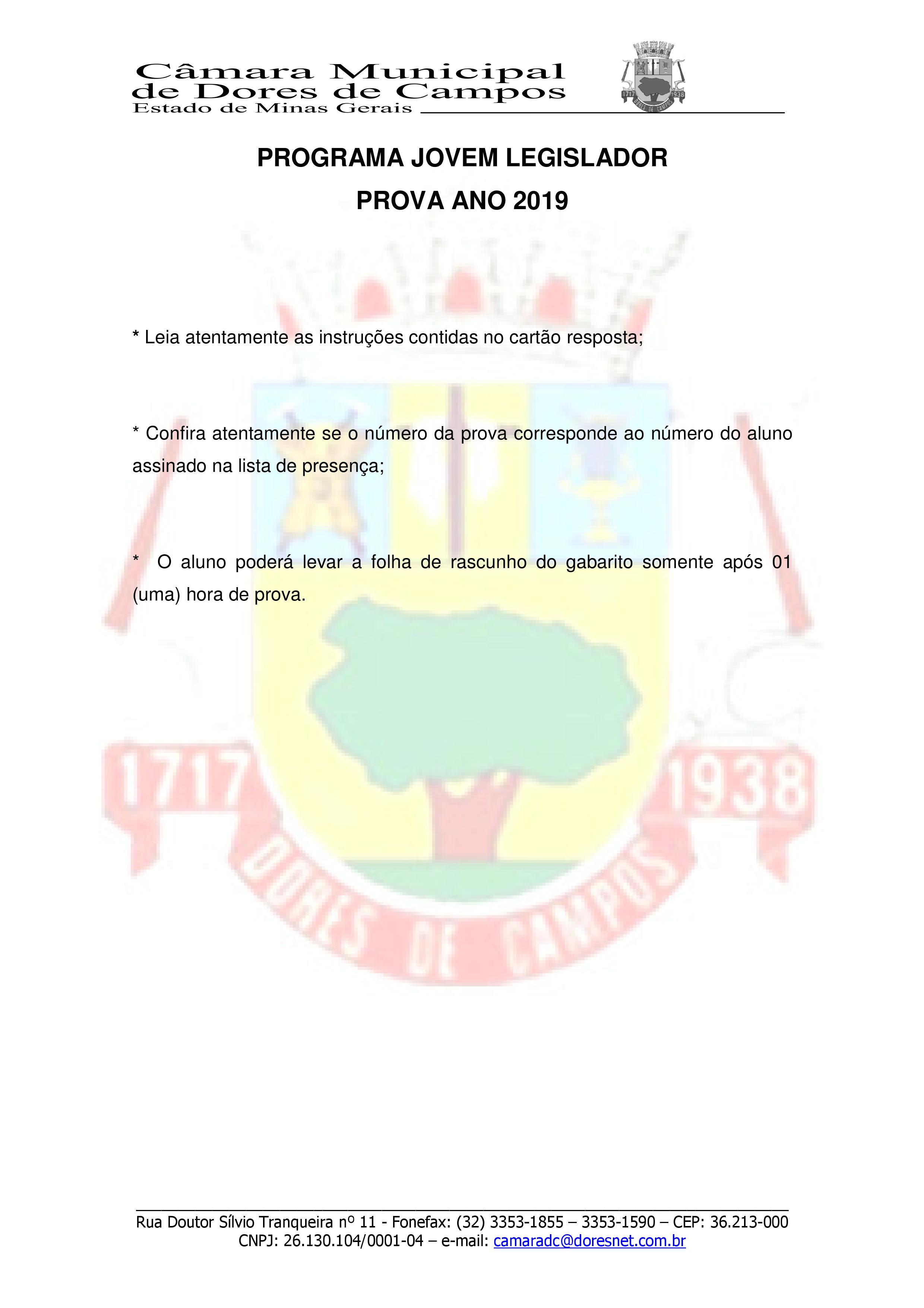Com absoluta exclusividade, estamos publicando o Gabarito Oficial da prova do Jovem Legislador 2019 da Câmara Municipal de Dores de Campos. A prova foi aplicada no último sábado (26) na Escola Municipal Randolfo Teixeira e contou com a participação dos alunos da Escola Estadual Duque de Caxias e do Centro Educacional Wanderley Arruda (CEWA).