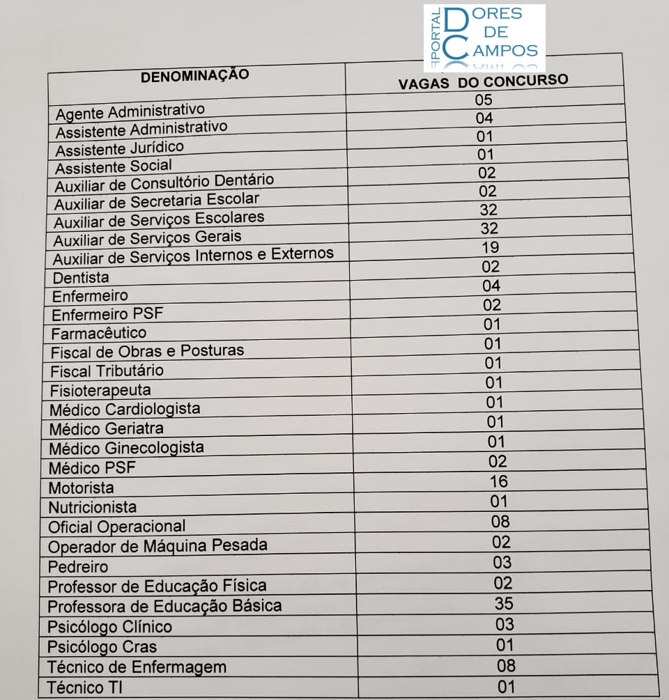 Com absoluta exclusividade a nossa reportagem apurou as 197 vagas que serão disponibilizadas no concurso público que a Prefeitura Municipal de Dores de Campos será obrigada a realizar até maio do ano que vem, conforme o Termo de Ajustamento de Conduta (TAC) assinado com o Ministério Público. O projeto de lei complementar 03/2019, que trata do Plano de Cargos e Salários e os Vencimentos dos Servidores Públicos Municipais já está tramitando na Câmara em caráter de urgência, mas ainda não tem data para ser votado. Além das 195 vagas abaixo, ainda tem duas vagas que não foram preenchidas no processo seletivo da Vigilância Epidemiológica.