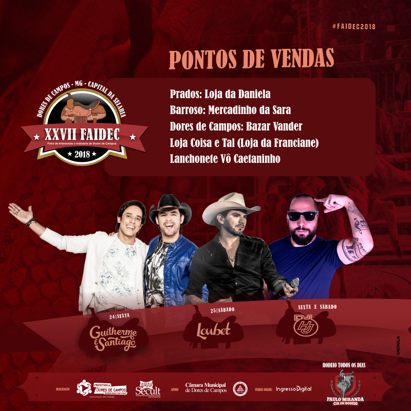 A partir desta sexta-feira (17/08) virou o lote dos preços do ingresso individual e do passaporte da FAIDEC 2018. O ingresso individual subiu para R$ 45,00 e o passaporte para os dois shows para R$ 60,00. A Feira de Artesanato e Indústria de Dores de Campos (FAIDEC) será realizada na próxima semana, entre os dias 23 e 26, no Parque de Exposições Maria José de Melo no bairro Paloma. Na quinta-feira (23/08) e domingo (26/08) a entrada será franca, mas na sexta-feira (24/08) o show de Guilherme e Santiago e no sábado (25/08) o show de Loubet terá cobrança de bilheteria.