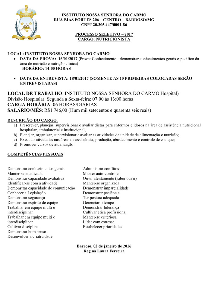 O Hospital Prefeito Macedo Couto, em Barroso, lançou edital para realização de processo seletivo para o cargo de Nutricionista. A data da prova é dia 16 de janeiro (Segunda-feira), às duas horas da tarde. A carga horária de trabalho é de 6 horas diárias, com salário de R$ 1.746,00. Os interessados deverão procurar o Hospital para efetuar a inscrição. Os 10 primeiros colocados passarão para a entrevista, no dia 18 de janeiro (Quarta-feira). Confira a íntegra do edital: