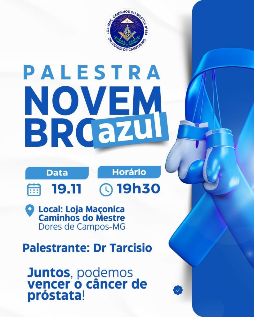 A Loja Maçônica Caminhos do Mestre promove, no dia 19 de novembro, às 19h30, uma palestra especial em apoio à campanha Novembro Azul, voltada à conscientização sobre a saúde do homem e a prevenção do câncer de próstata. O evento será realizado na sede da Loja Maçônica, em Dores de Campos, e contará com a presença do Dr. Tarcísio, que abordará a importância do diagnóstico precoce e os cuidados necessários para a prevenção da doença. A iniciativa reforça o compromisso da comunidade dorense com a promoção da saúde e o incentivo à informação. Com o tema “Juntos, podemos vencer o câncer de próstata!”, a palestra busca quebrar tabus e incentivar os homens a cuidarem de sua saúde com responsabilidade e regularidade.