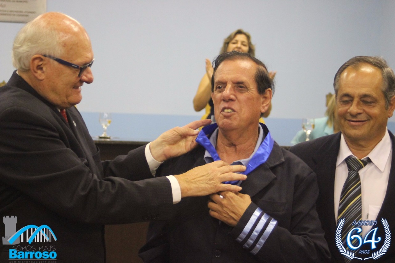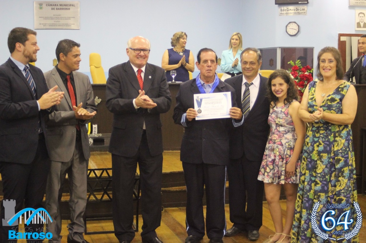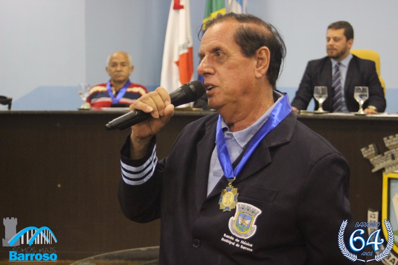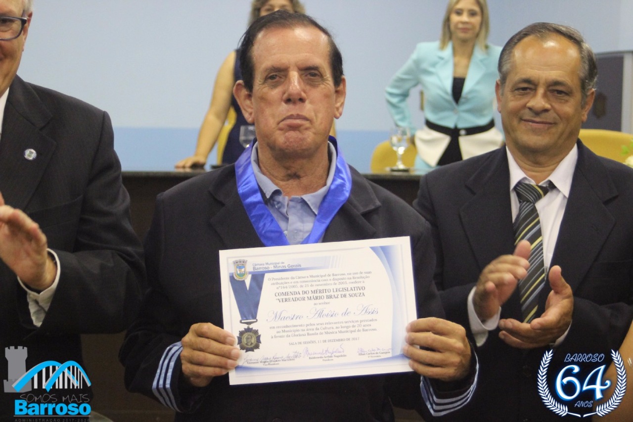A maior Comenda do município de Barroso, a Medalha do Mérito Legislativo Mário Braz de Souza, foi entregue ao dorense Aloísio de Assis, que neste ano de 2017, está completando 20 anos como maestro da Banda de Música Municipal de Barroso. A entrega foi realizada na noite desta segunda-feira (11/12), durante a Sessão Solene em homenagem aos 64 anos de emancipação política-administrativa de Barroso, comemorado nesta terça-feira (12/12).