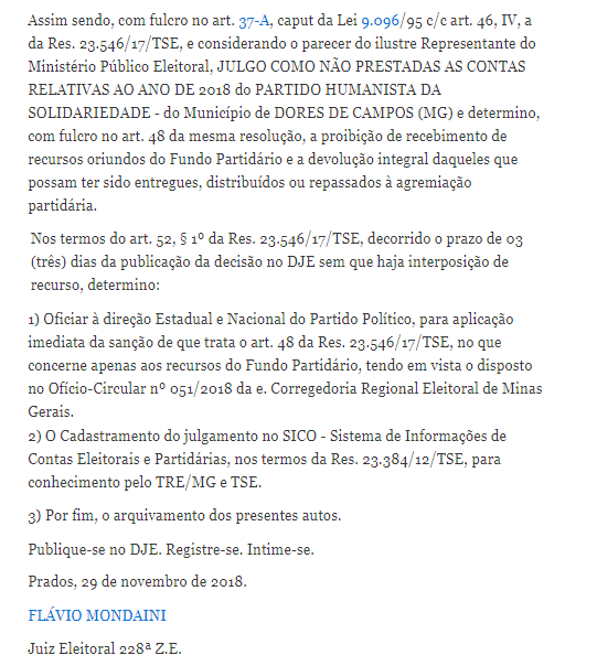 Depois do PSDB, a justiça eleitoral suspendeu mais um partido de aluguel em Dores de Campos. O Diretório Municipal do PHS também foi suspenso pela justiça eleitoral por falta de prestação de contas do ano de 2017. A decisão é do juiz da Comarca de Prados, doutor Flavio Mondaini, que ordenou a suspensão de qualquer repasse financeiro ao partido e ainda determinou a imediata comunicação aos Diretórios Estadual e Nacional.