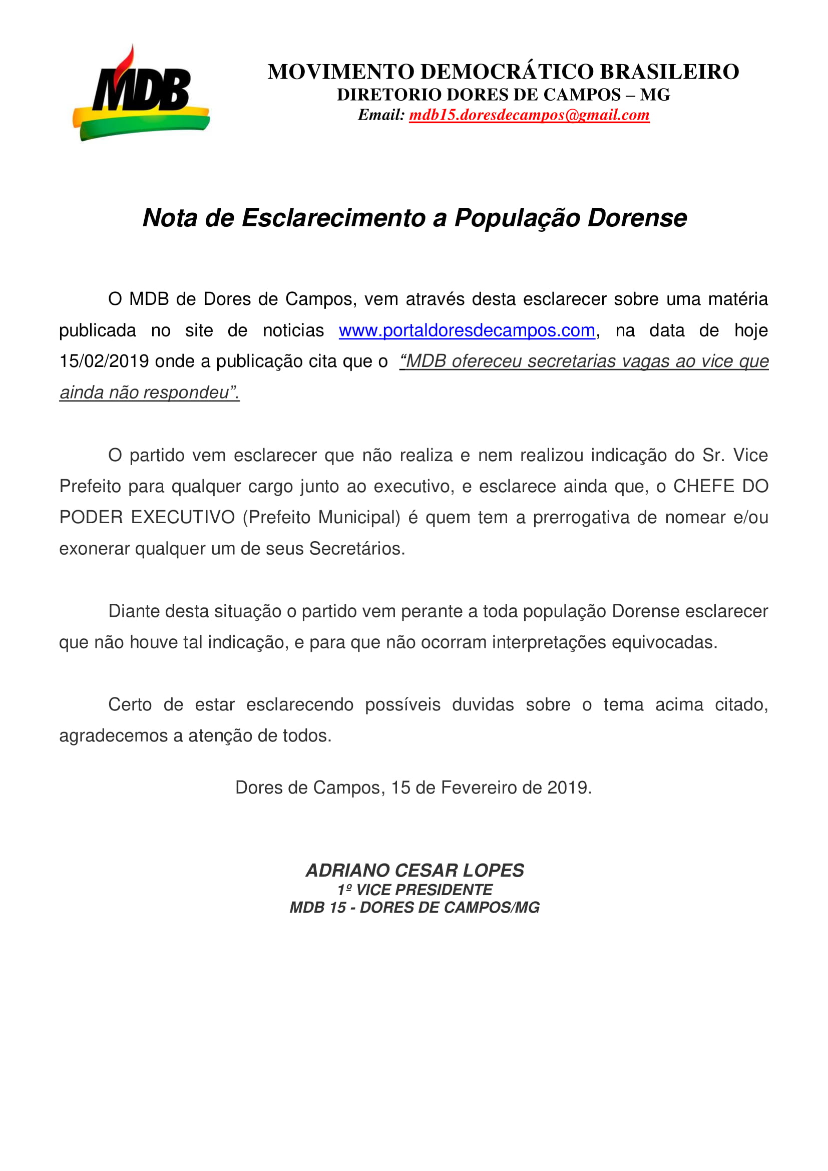 O primeiro vice-presidente do MDB, Adriano Lopes, enviou uma Nota afirmando que o partido não teria indicado o vice-prefeito Aguinaldo do Lado (MDB) para assumir as duas secretárias que estão sem os seus respectivos titulares. Que cabe ao prefeito Marcílio Cotta (MDB) nomear ou exonerar qualquer um de seus secretários, sem a interferência do partido.