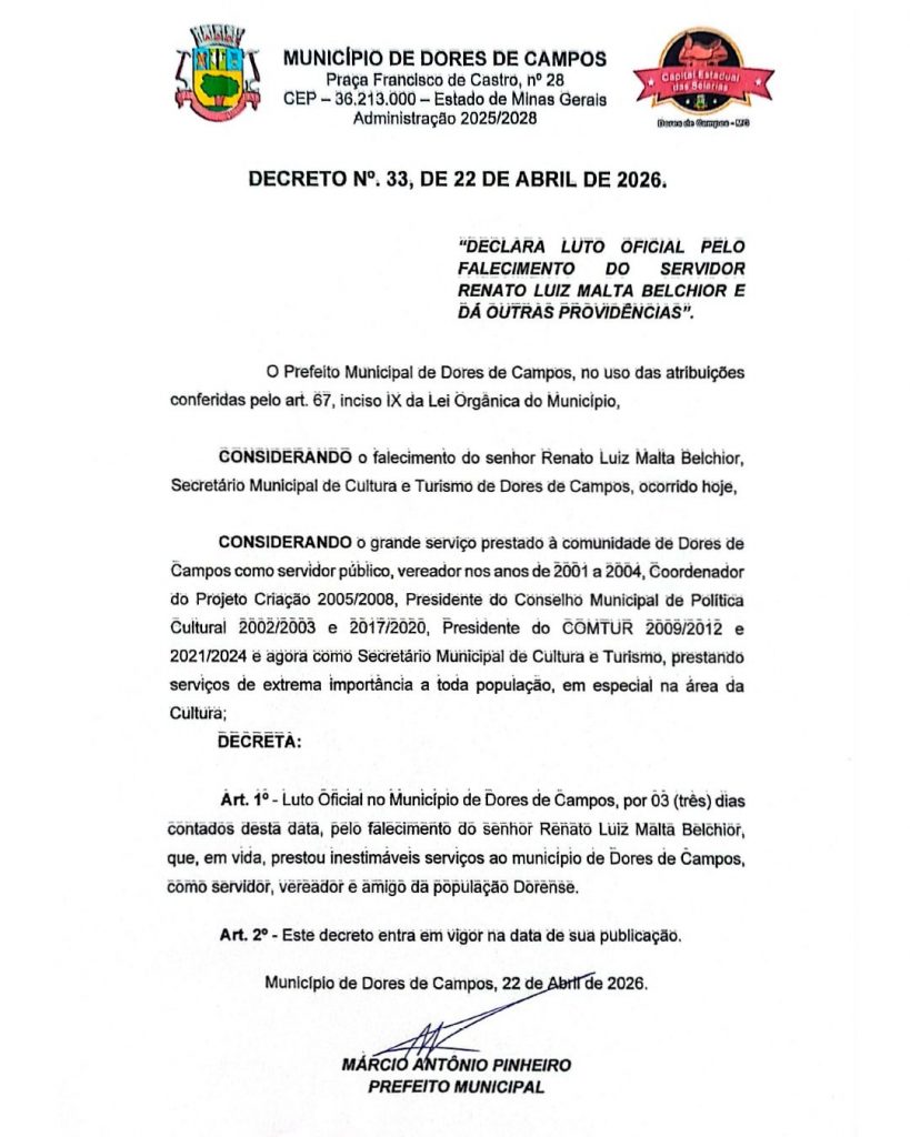 Em sinal de respeito e pesar, o prefeito Marcinho do Tica (MDB) decretou luto oficial de três dias no município. A notícia gerou diversas manifestações de tristeza entre moradores, amigos e lideranças políticas, que destacaram a dedicação de Renatão ao serviço público e à cultura de Dores de Campos.