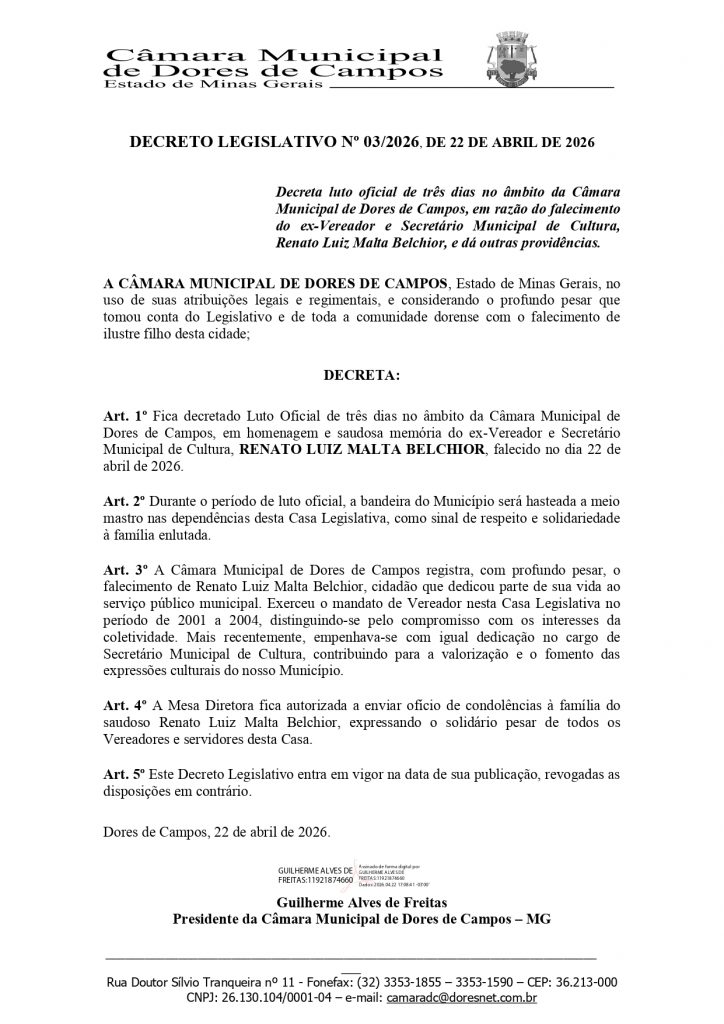 O presidente da Câmara Municipal, vereador Guilherme do Valtinho (MDB), também emitiu uma Nota de Pesar, solidarizando-se com familiares e amigos neste momento de dor. O sepultamento será nesta quinta-feira (23/04), às 9 horas no Cemitério Municipal de Dores de Campos.