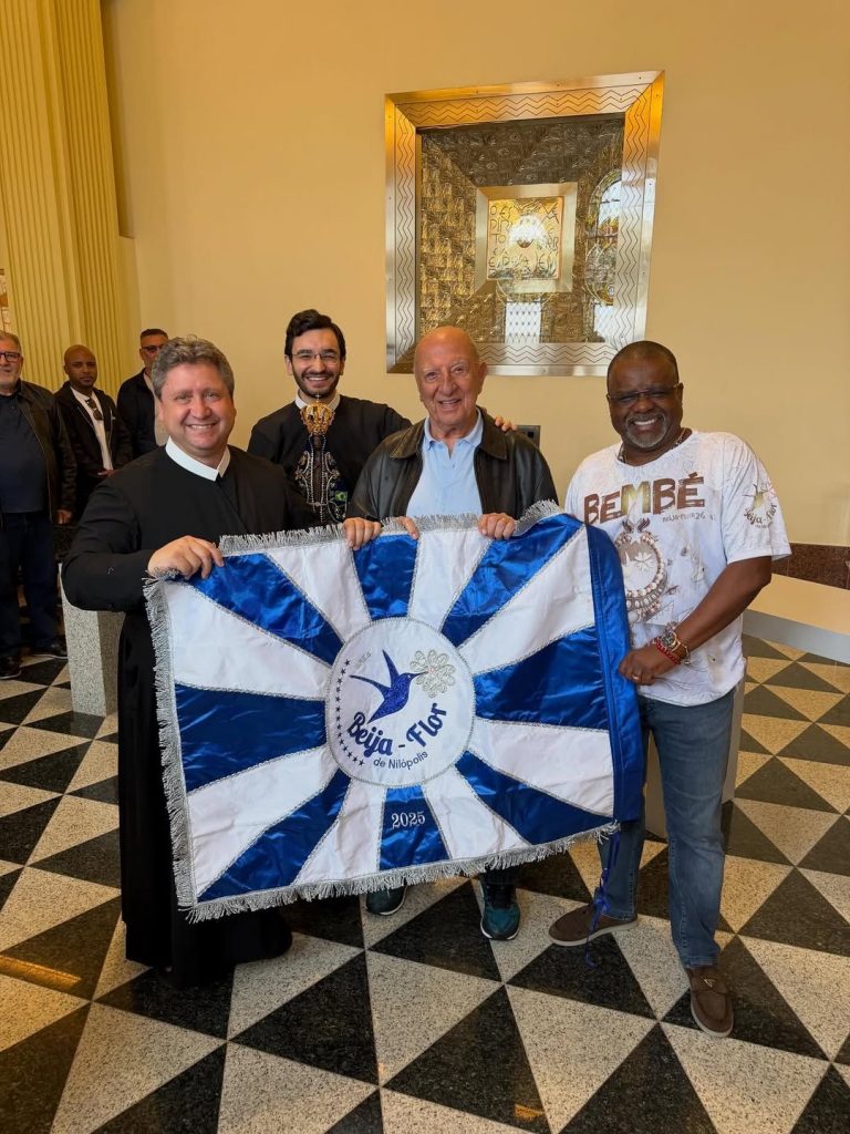 O presidente de honra da Beija-Flor de Nilópolis, Anízio Abraão David, e o presidente Almir Reis estiveram na Basílica de Nossa Senhora Aparecida para entregar o pavilhão usado no desfile campeão de 2025 na Marquês de Sapucaí no Rio de Janeiro, em um gesto de fé e agradecimento. A cerimônia contou com a presença do padre Pablo Moreira, natural de Dores de Campos, que participou da celebração e conduziu as orações em homenagem à padroeira do Brasil. Em nota, a escola destacou o sentimento de devoção e gratidão: “Que Nossa Senhora Aparecida continue guiando nossos caminhos e abençoando toda a nossa comunidade.”