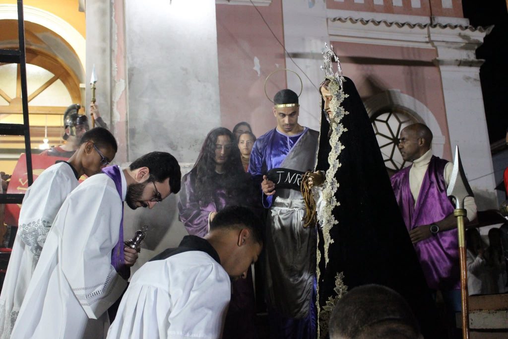 O Sermão do Descendimento da Cruz contou com a condução do Padre Plínio Ataíde da Silva Almeida, sacerdote da Paróquia de São Judas Tadeu, em São João del-Rei. A celebração reuniu fiéis em um momento de intensa espiritualidade e contemplação durante a Semana Santa. Em sua pregação, o padre ressaltou o significado do sacrifício de Jesus Cristo, destacando a entrega por amor à humanidade e a necessidade de conversão dos fiéis. A reflexão também abordou a dor de Maria ao receber o corpo do Filho, símbolo de fé e perseverança mesmo diante do sofrimento.