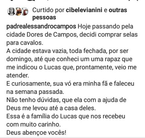 Leia abaixo, a postagem do padre Alessandro Campos no Istagram: