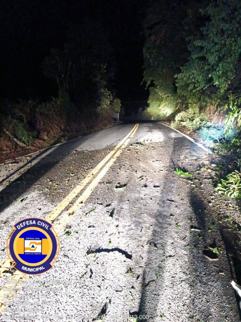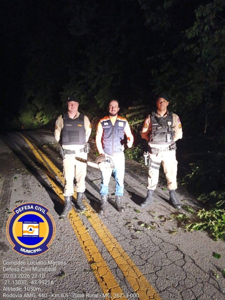 Na noite desta sexta-feira (20/03), a Polícia Militar acionou a Defesa Civil para a retirada de uma árvore que caiu na rodovia que liga os municípios de Dores de Campos e Barroso. A ocorrência mobilizou equipes no local para garantir a segurança dos motoristas e a liberação da via. O coordenador da Defesa Civil, Luciano Martins, acompanhou a ação ao lado do sargento Jorge e do sargento Lebourg.